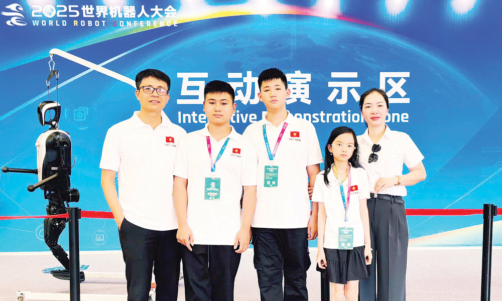 Hai học sinh xã Hiệp Hòa (thứ 2 và thứ 3 từ trái sang) giành Huy chương Bạc Cuộc thi sáng tạo điều khiển robot trong khuôn khổ Hội nghị robot thế giới năm 2025.