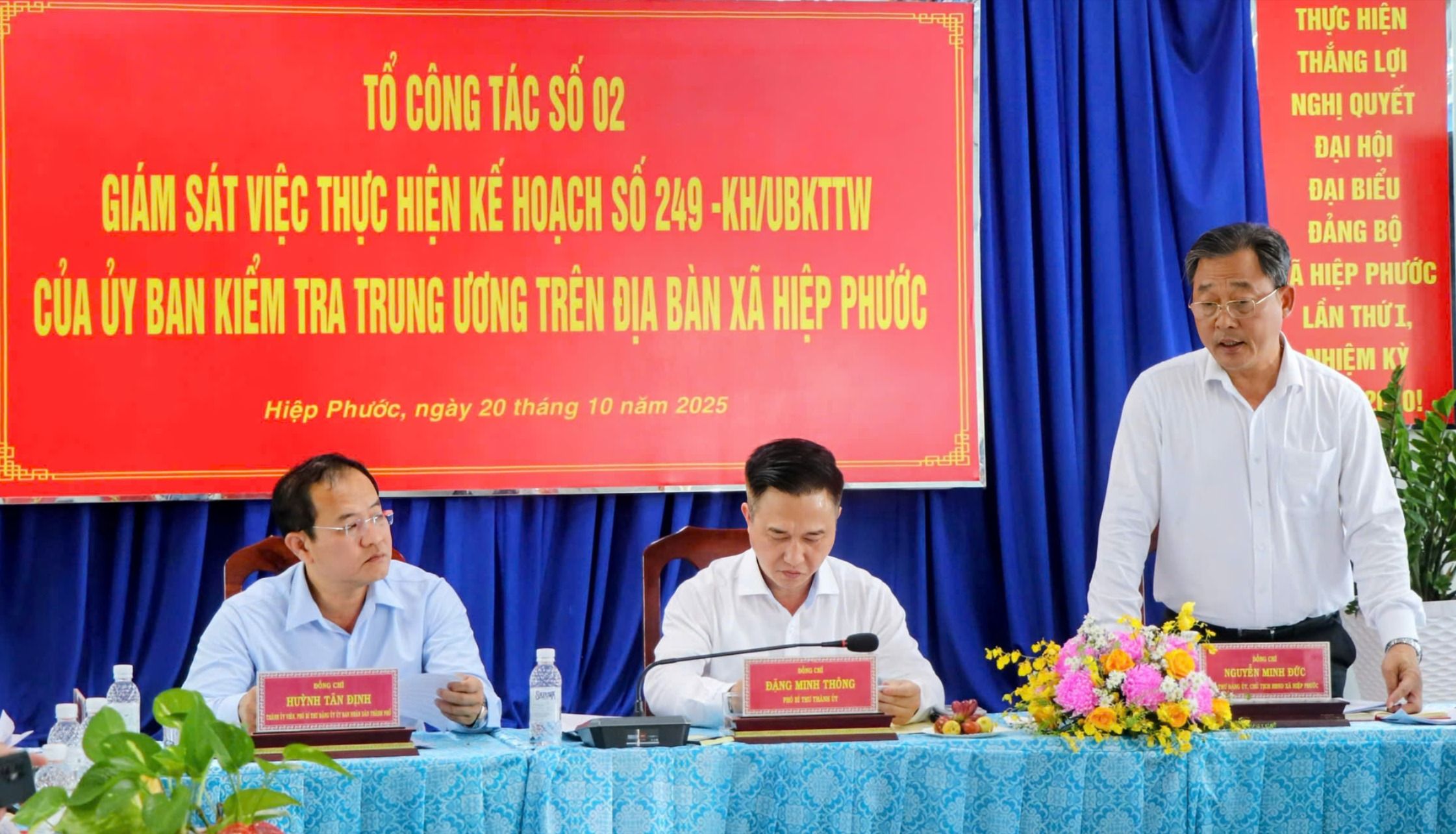 Chiều 20-10, Tổ công tác số 2 do đồng chí Đặng Minh Thông, Phó Bí thư Thành ủy TPHCM, làm tổ trưởng đã có buổi giám sát kết quả thực hiện Kế hoạch số 249-KH/UBKTTW của Ủy ban Kiểm tra Trung ương tại xã Hiệp Phước, TPHCM.