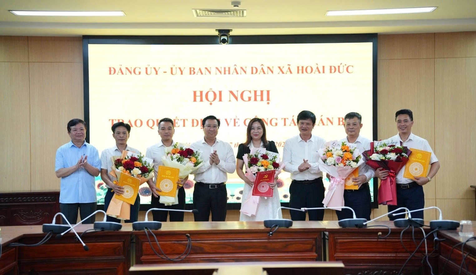 Lãnh đạo Đảng ủy, UBND xã Hoài Đức trao các quyết định bổ nhiệm. Ảnh: CH