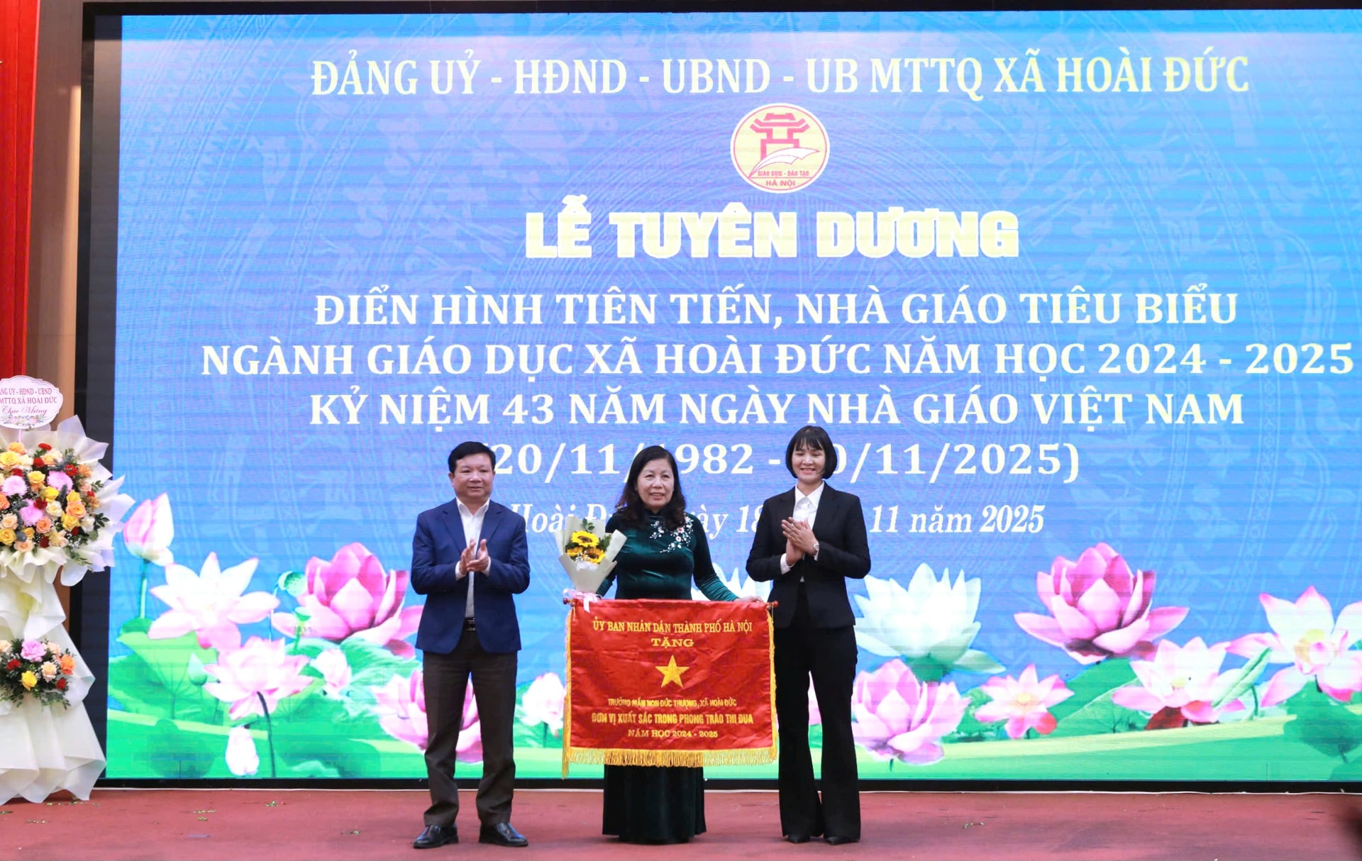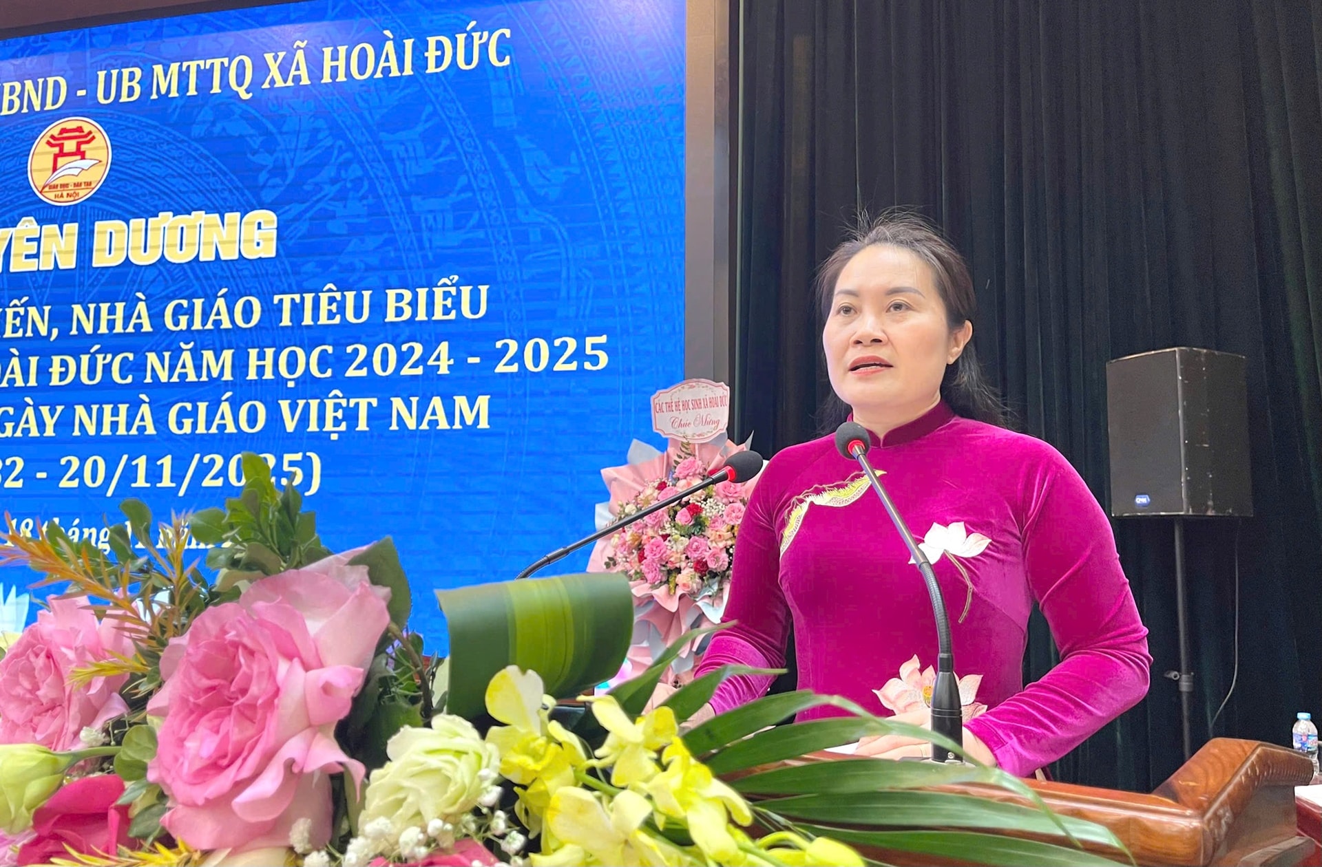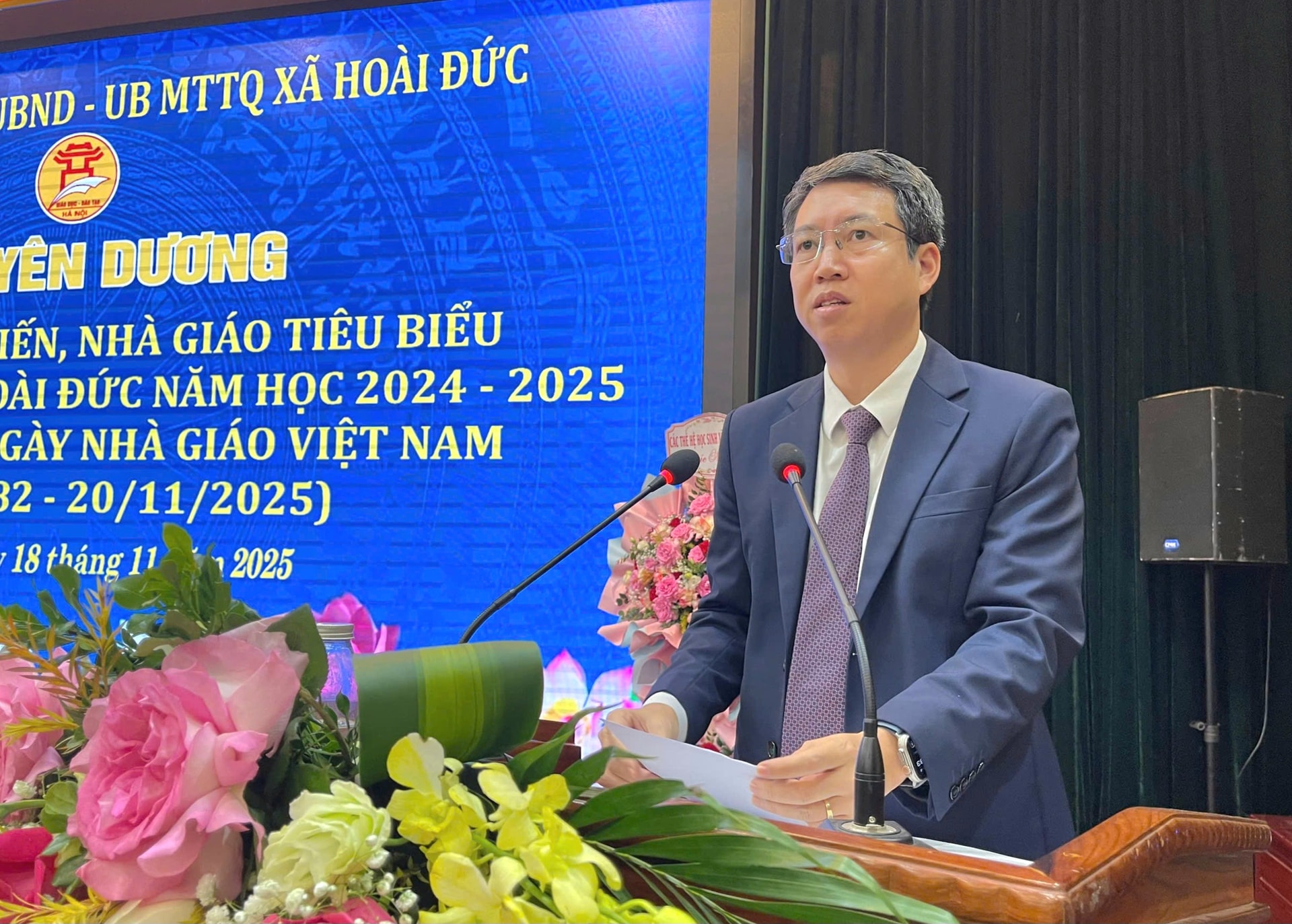 Phát biểu tại buổi lễ, Bí thư Đảng ủy, Chủ tịch HĐND Hoài Đức Nguyễn Hoàng Trường trân trọng ghi nhận và đánh giá cao những cống hiến của các nhà trường và đội ngũ thầy cô giáo xã Hoài Đức trong suốt thời gian qua, đồng thời nhấn mạnh: Đi cùng với sự cao quý của nghề giáo là rất nhiều khó khăn, vất vả và áp lực, nhưng các thầy cô giáo vẫn luôn bền bỉ, nhiệt huyết vì học sinh thân yêu. Địa phương luôn thấu hiểu và chia sẻ sâu sắc với những gian nan thầm lặng của đội ngũ nhà giáo. Lãnh đạo xã Hoài Đức mong mỗi nhà giáo tiếp tục kiên định, bản lĩnh, nỗ lực phấn đấu với tinh thần tất cả vì học sinh thân yêu, vì thế hệ tương lai của đất nước.