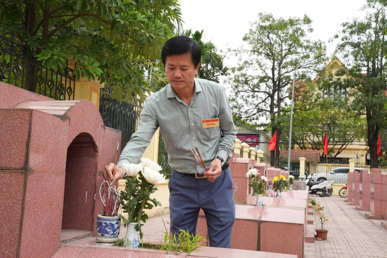 Phó Bí thư Thường trực Đảng ủy xã Hồng Vân Nguyễn Tuấn Đạt dâng hương tại Nghĩa trang Ninh Sở. Ảnh: Vũ Hậu.