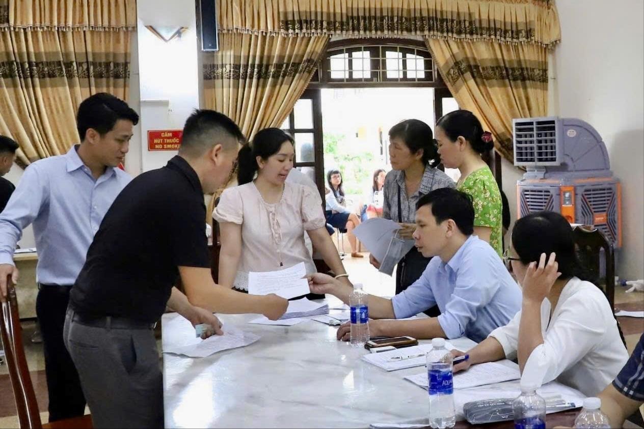 Chuyên viên Điểm hỗ trợ dịch vụ công số Hồng Vân thực hiện nhiệm vụ tại các điểm chi trả tiền hỗ trợ giải phóng mặt bằng. Ảnh: Vũ Hậu.