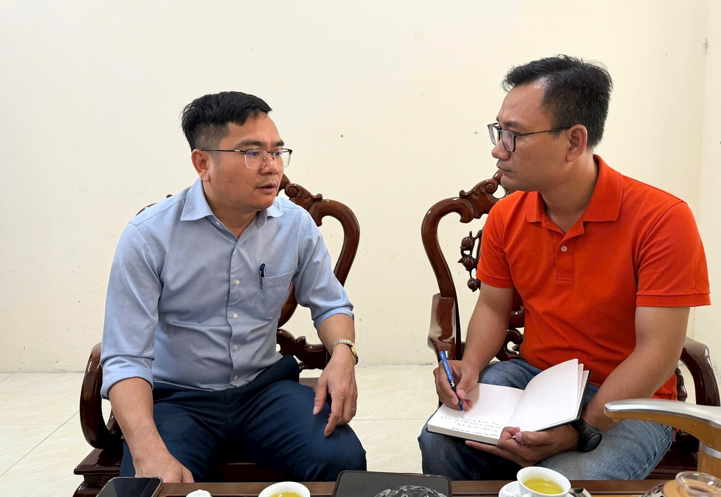 Phó Giám đốc Ban Quản lý dự án đầu tư - hạ tầng xã Hương Sơn Nguyễn Duy Quỳnh (trái) chia sẻ với phóng viên Báo và Phát thanh, Truyền hình Hà Nội. Ảnh: Vân Nga