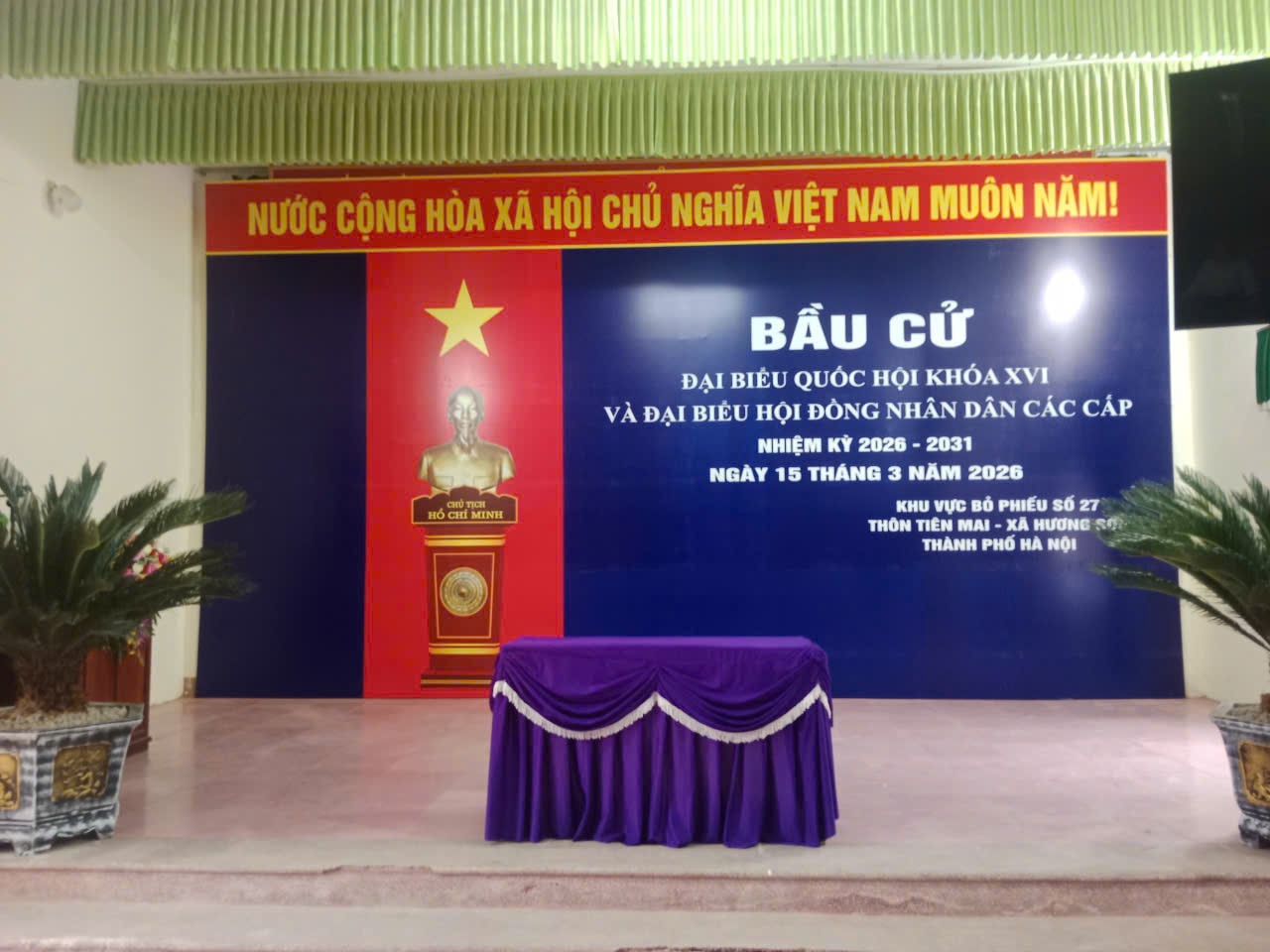 Nhà văn hóa thôn Tiên Mai (khu vực bỏ phiếu số 27) đang hoàn tất những khâu cuối cùng cho ngày bầu cử. Ảnh: VB