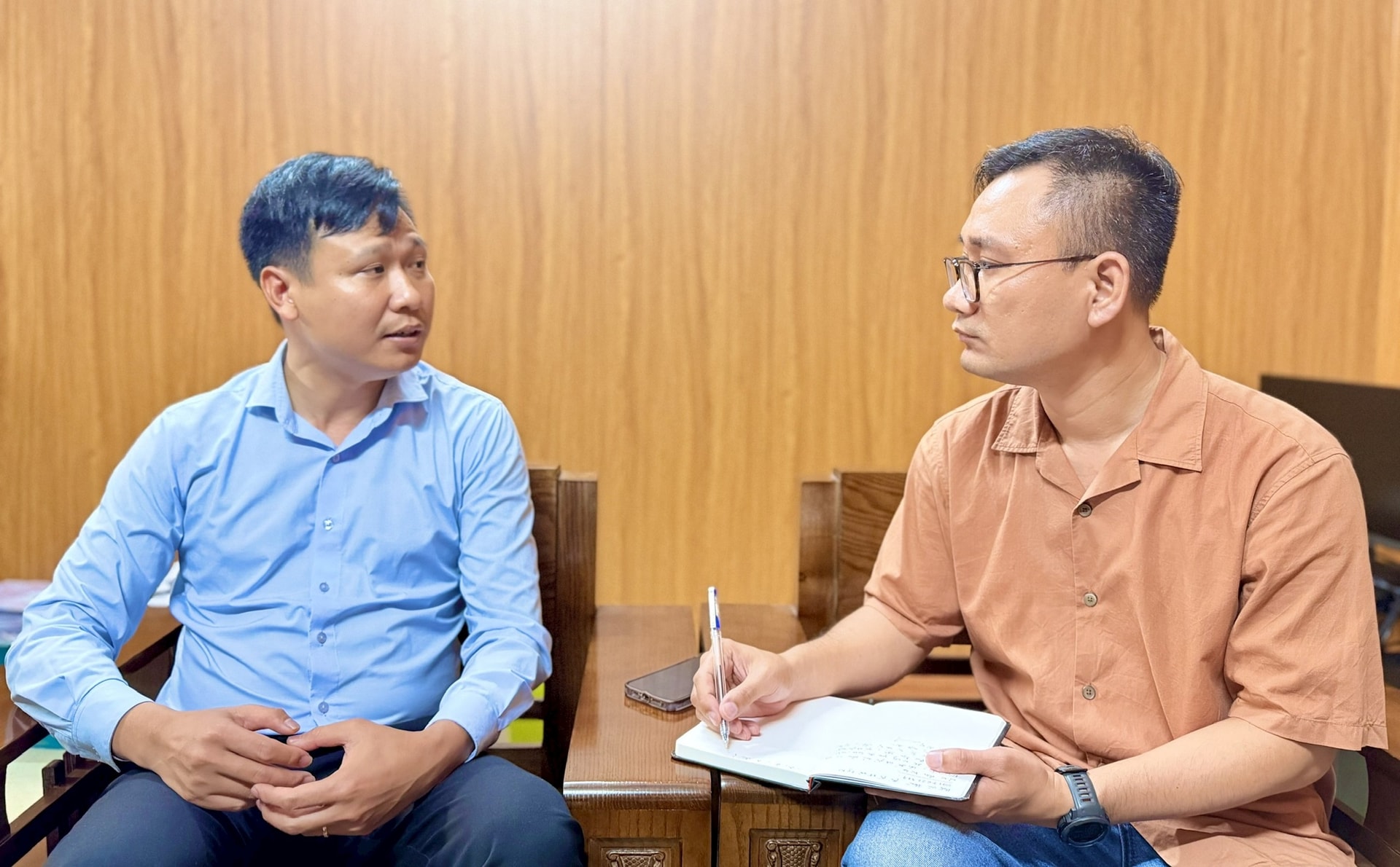 Phó Trưởng phòng Kinh tế xã Hương Sơn Hoàng Văn Hoàn (trái) trao đổi với phóng viên Cơ quan báo và phát thanh, truyền hình Hà Nội. Ảnh: Vân Nga