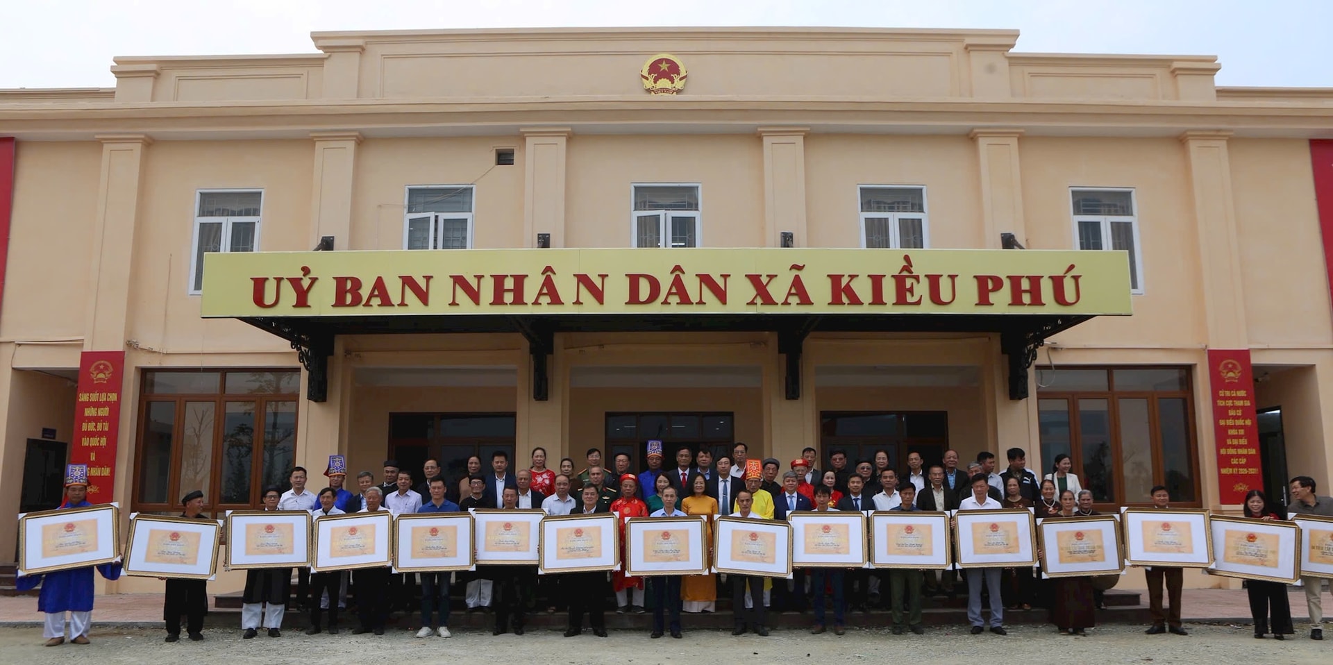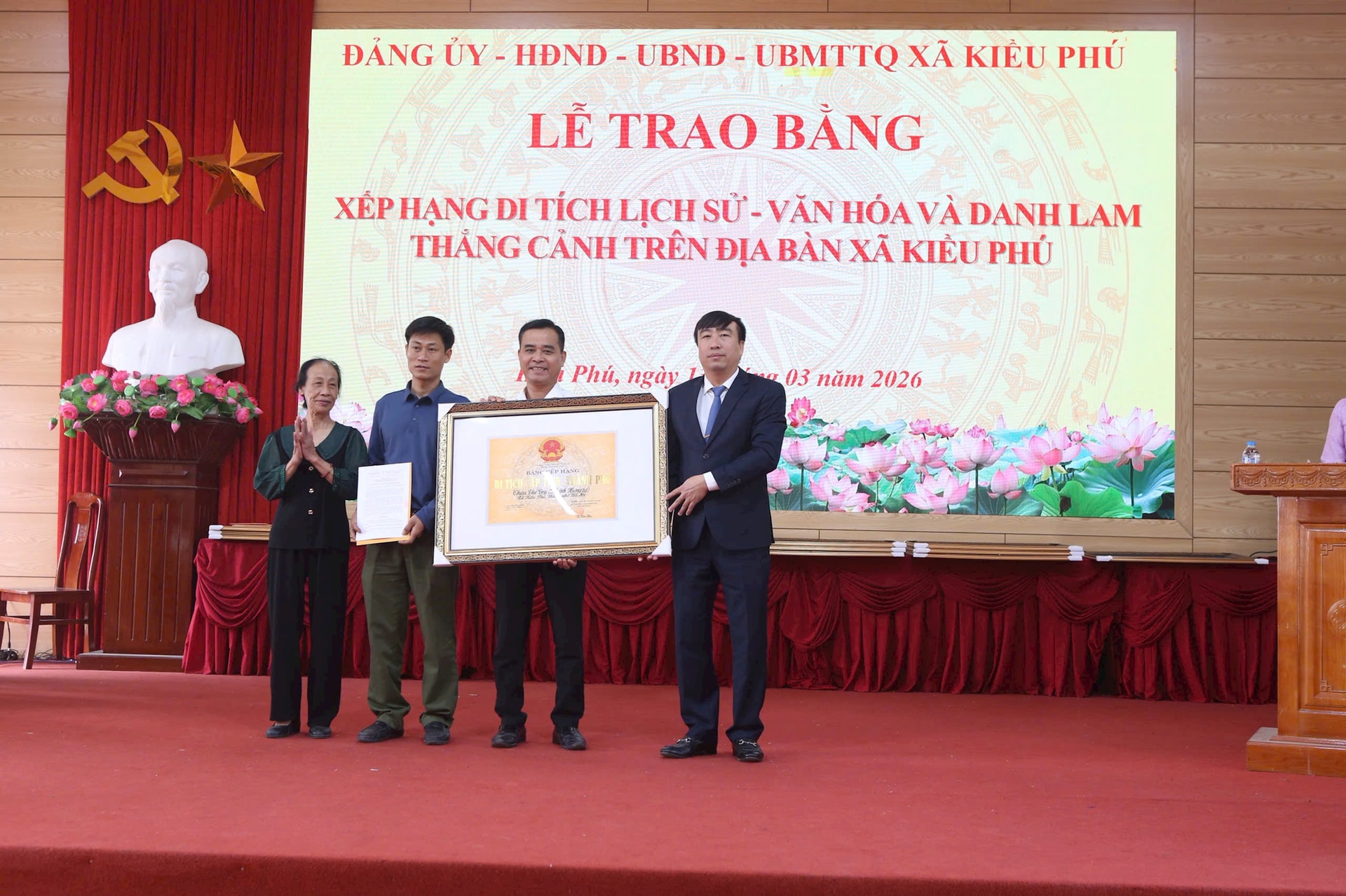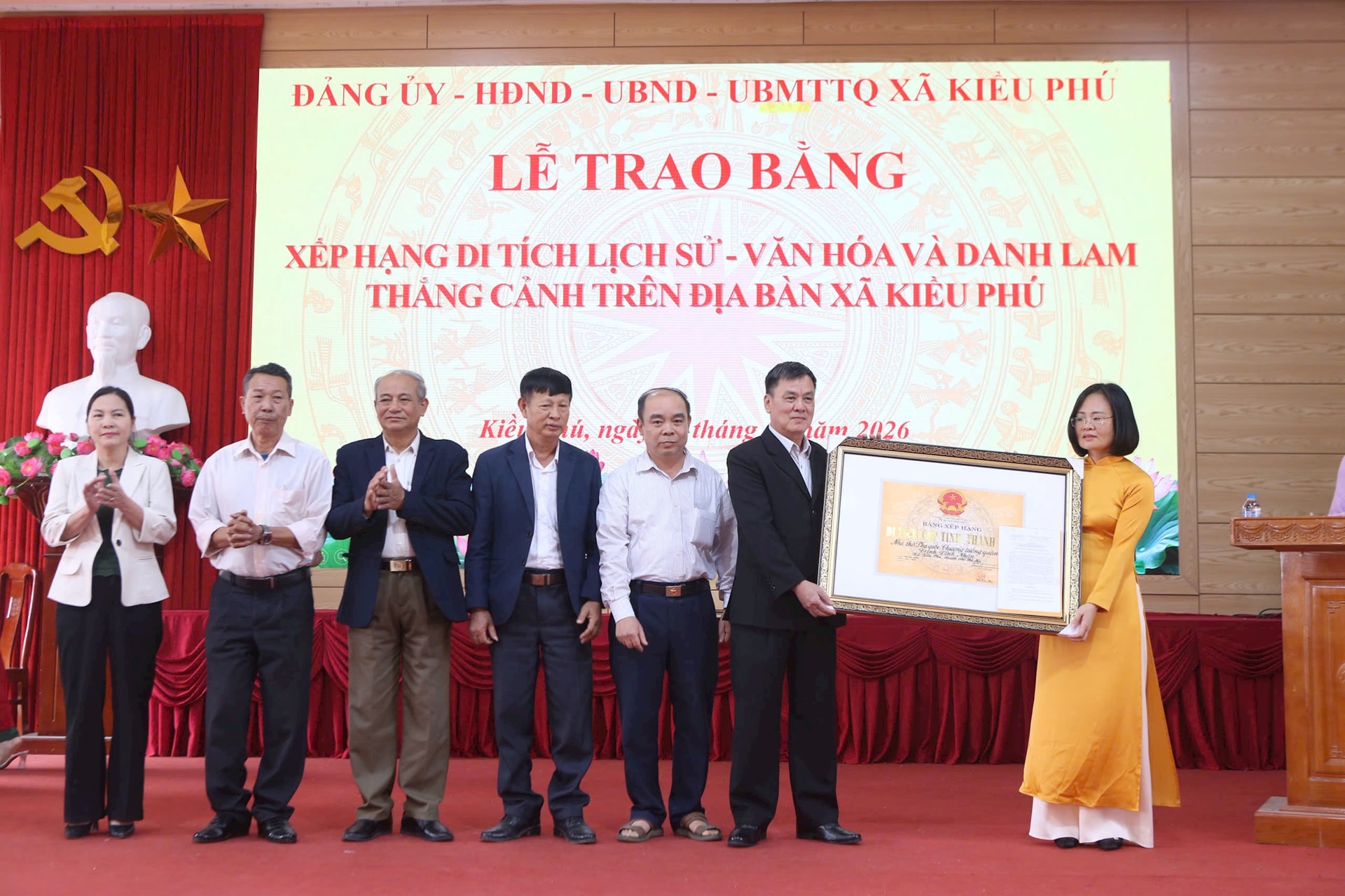UBND xã Kiều Phú tổ chức hội nghị trao bằng và quyết định xếp hạng cho 17 di tích tại các cơ sở thôn trên địa bàn xã. Ảnh: Nguyễn Mạnh