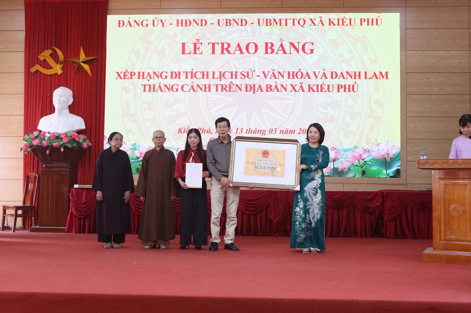 Chủ tịch Ủy ban Mặt trận Tổ quốc xã Nguyễn Thị Thu Trang trao Bằng xếp hạng cho đại diện chùa Thượng Khê (Hưng Quang Tự)