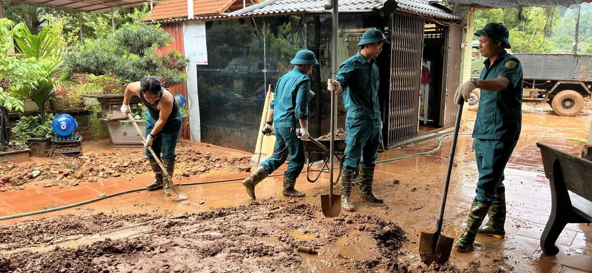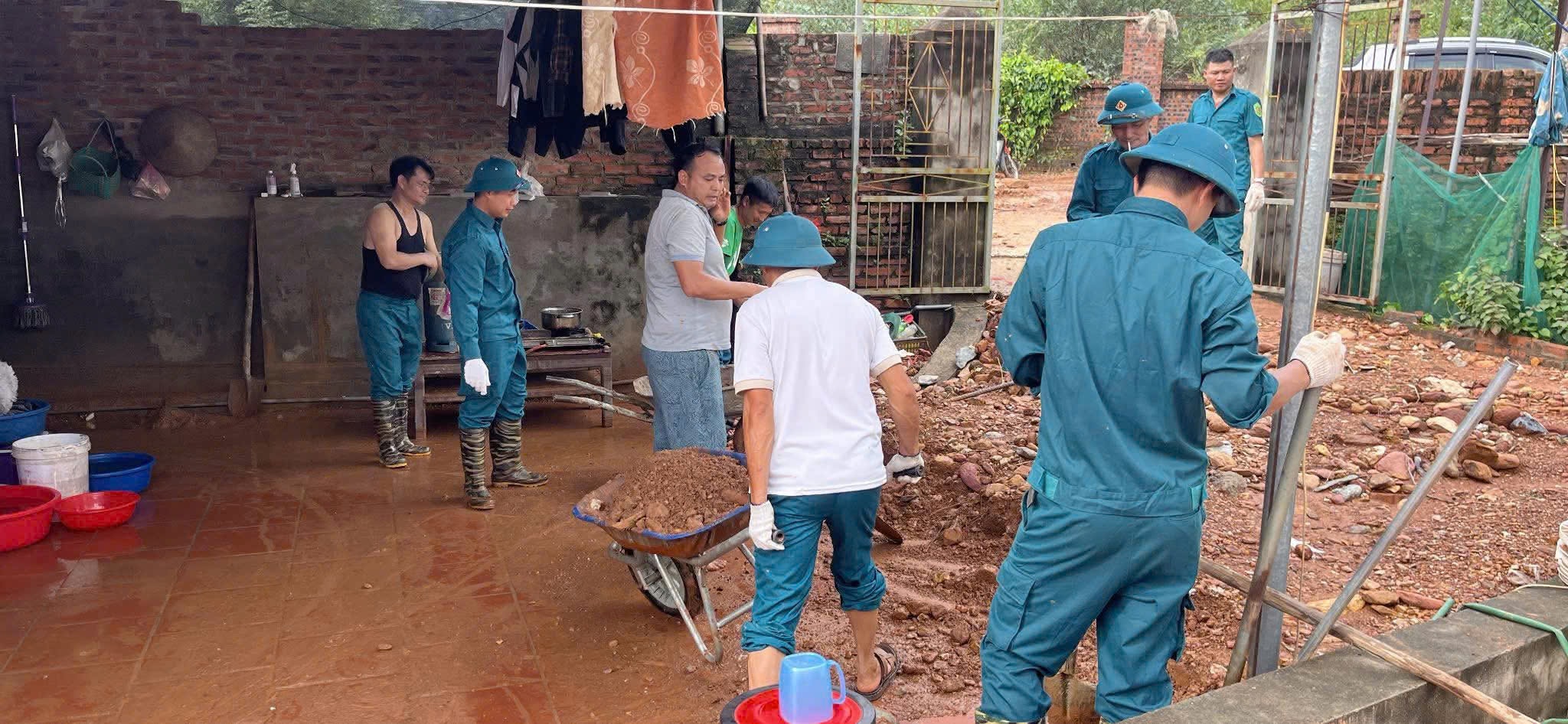 Lực lượng dân quân tự vệ hỗ trợ người dân xã Kim Anh dọn dẹp bùn đất trong đợt mưa bão tháng 10-2025. Ảnh: Lương Giang