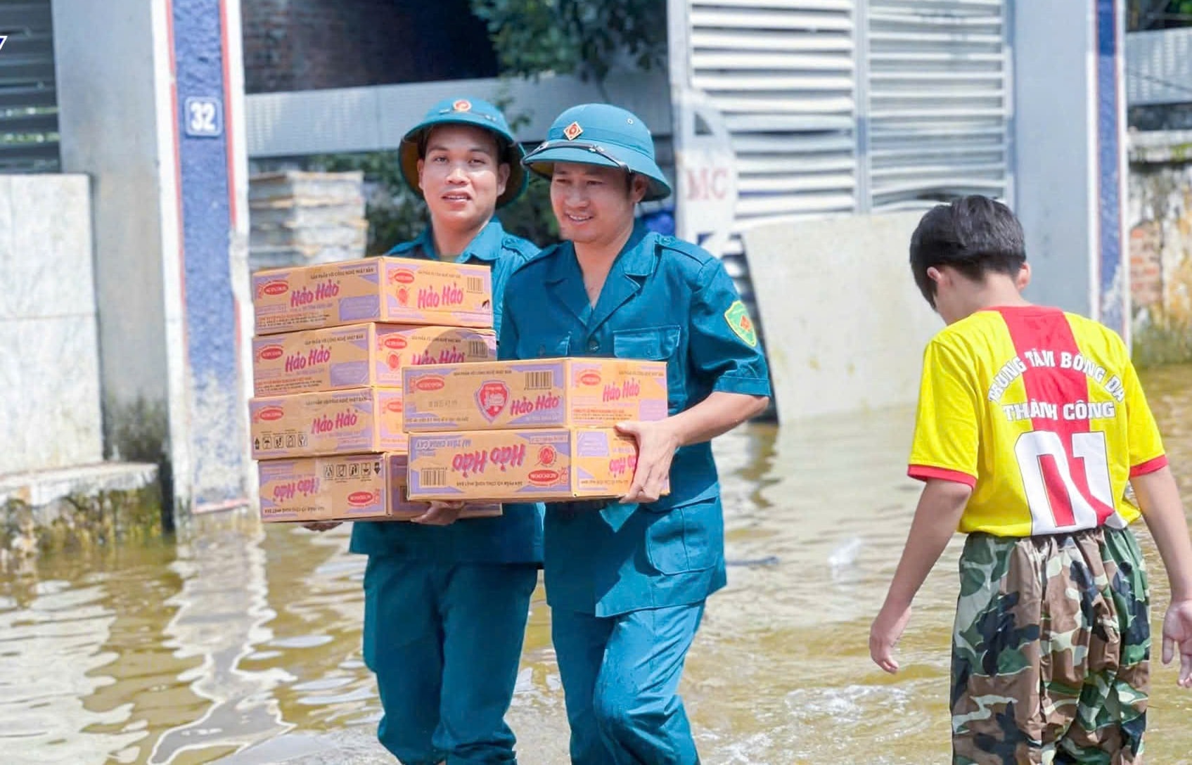 Tiếp tế nhu yếu phẩm cho người dân thuộc các khu vực ngập lụt, chia cắt do bão lũ tại xã Kim Anh. Ảnh: Lương Giang
