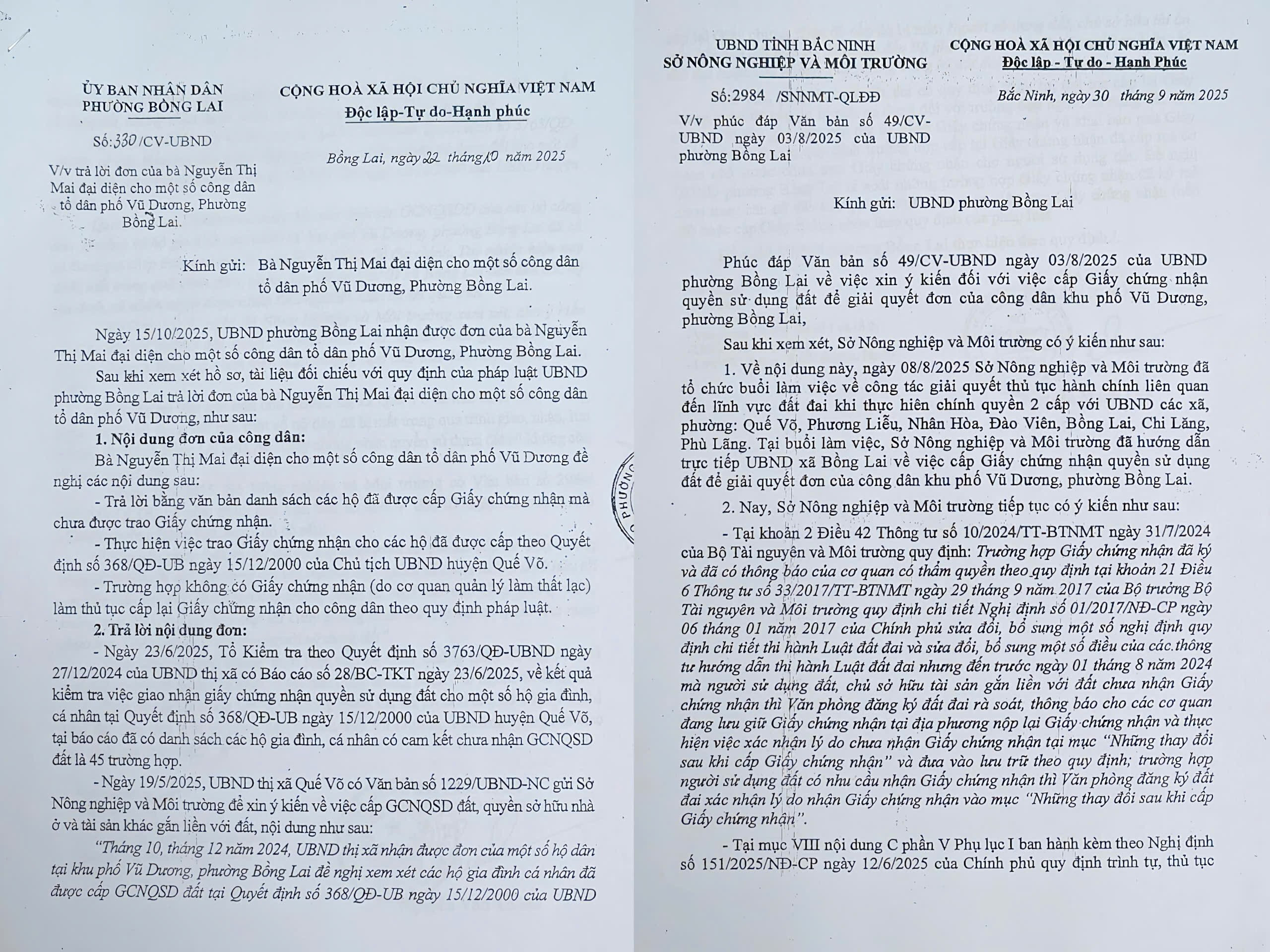 Văn bản của UBND phường Bồng Lai và Sở Nông nghiệp và Môi trường tỉnh Bắc Ninh trả lời người dân khu phố Vũ Dương.