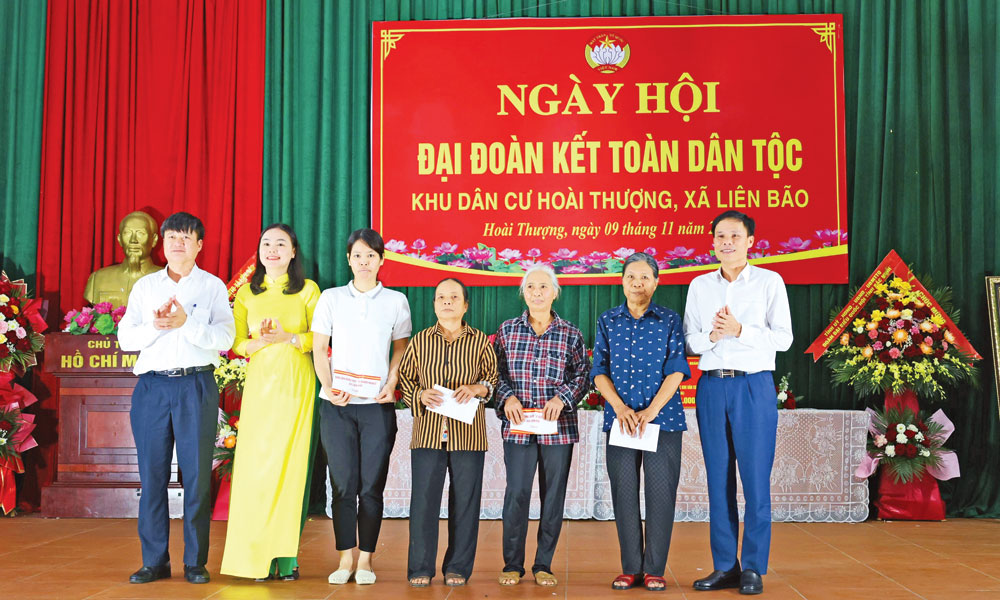 Lãnh đạo xã Liên Bão tặng quà cho các gia đình hoàn cảnh khó khăn ở thôn Hoài Thượng.