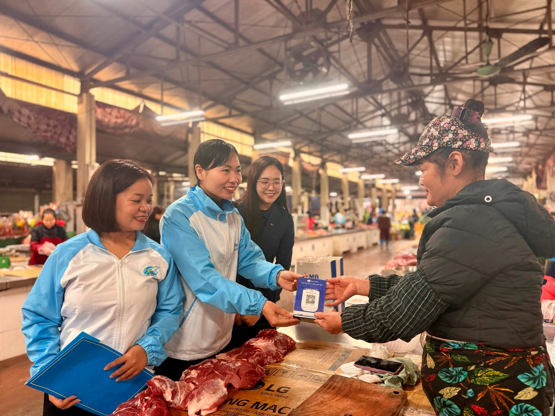 Hội Liên hiệp phụ nữ xã Liên Minh tặng các tiểu thương mã QR thực hiện thanh toán không dùng tiền mặt. Ảnh: Nguyễn Bền