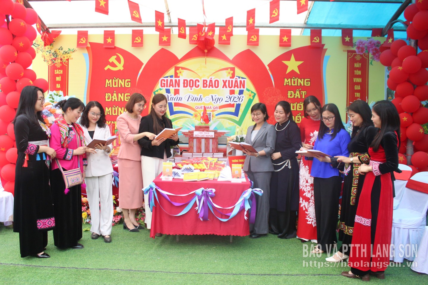 Các đại biểu và người dân đọc sách, báo trong gian đọc báo xuân tại lễ hội