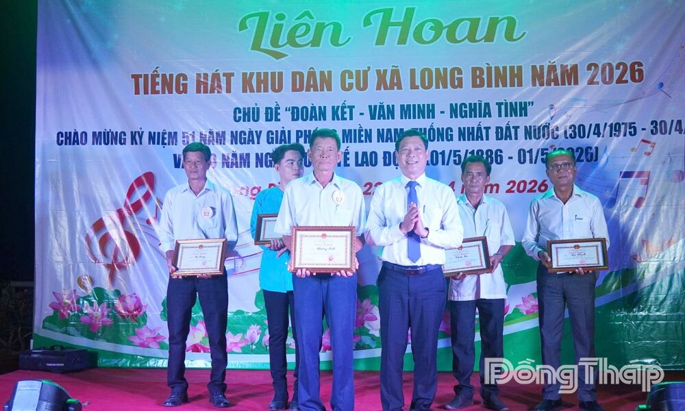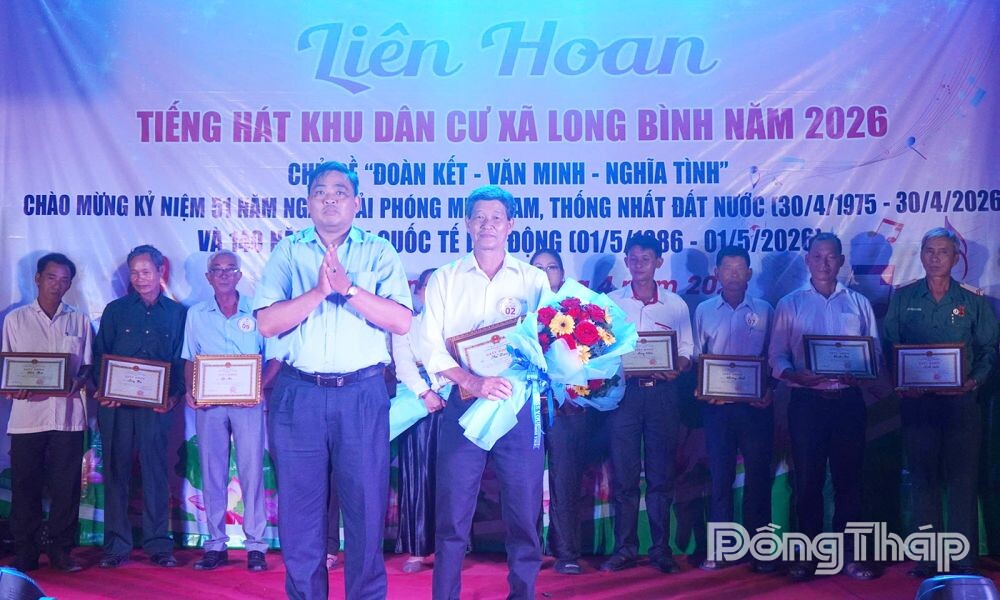 Đồng chí Võ Văn Chiến, Phó Giám đốc Sở Văn hóa, Thể thao và Du lịch tỉnh Đồng Tháp trao thưởng cho Đội đoạt giải Nhất phần thi văn nghệ.
