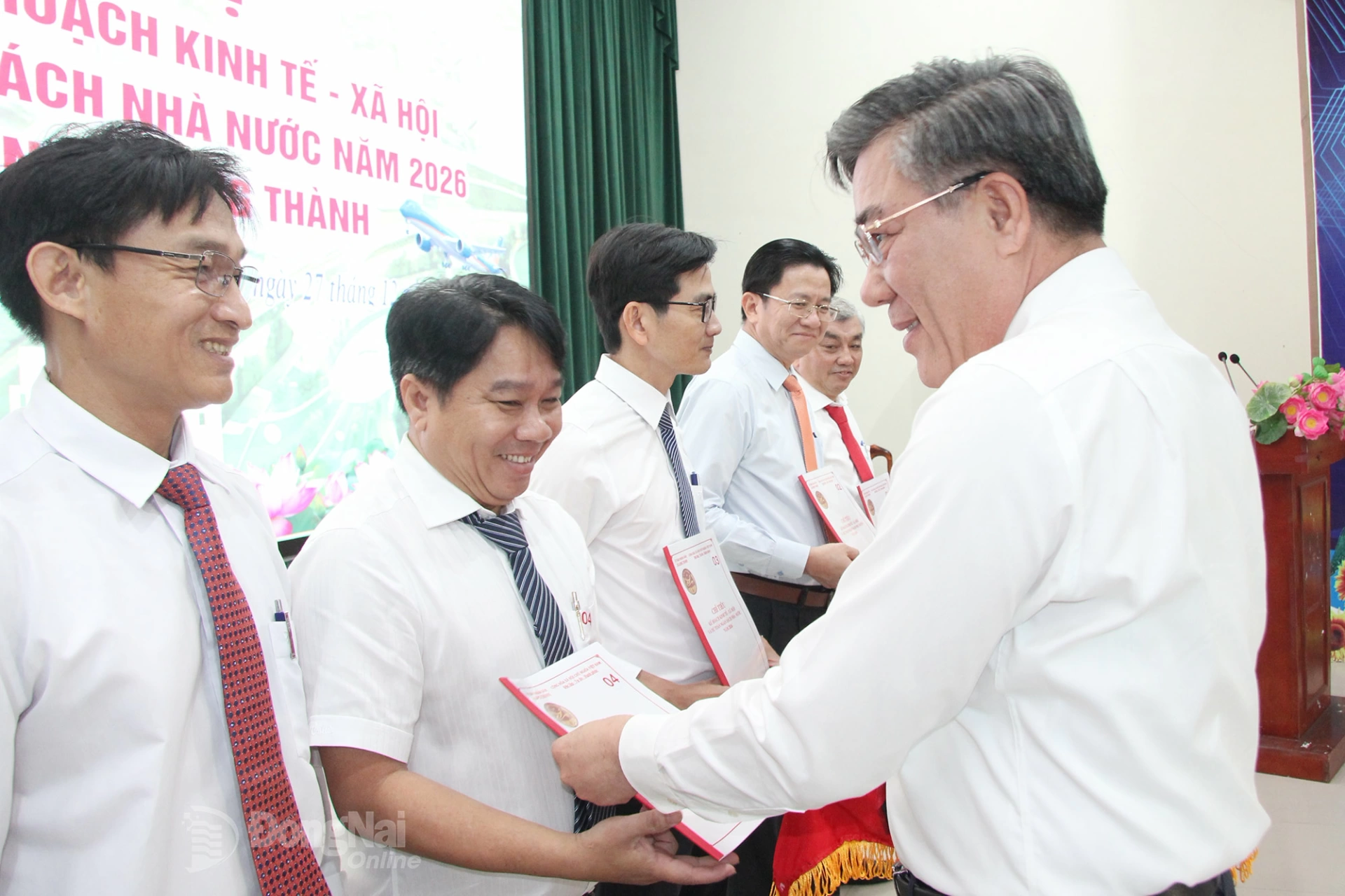 Phó Bí thư Đảng ủy, Chủ tịch UBND xã Long Thành Lê Hoàng Sơn trao quyết định giao chỉ tiêu kế hoạch phát triển kinh tế - xã hội và dự toán ngân sách nhà nước năm 2026 cho các cơ quan, đơn vị, trường học. Ảnh: ĐPCC