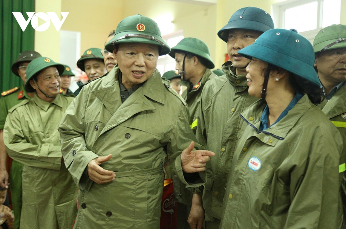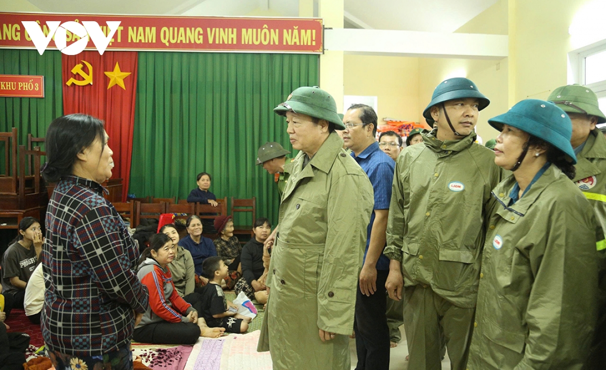 Phó Thủ tướng Trần Hồng Hà (thứ 2 từ trái qua) động viên nhân dân sơ tán tránh bão số 13 tại tỉnh Gia Lai