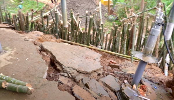 Bà Thương cho biết, trước đó vài ngày khu vực sân đã xuất hiện rạn nứt, đến từ 3–5 giờ sáng thì toàn bộ phần sân bị sụt xuống, nước xói từ lòng đất trào ra.