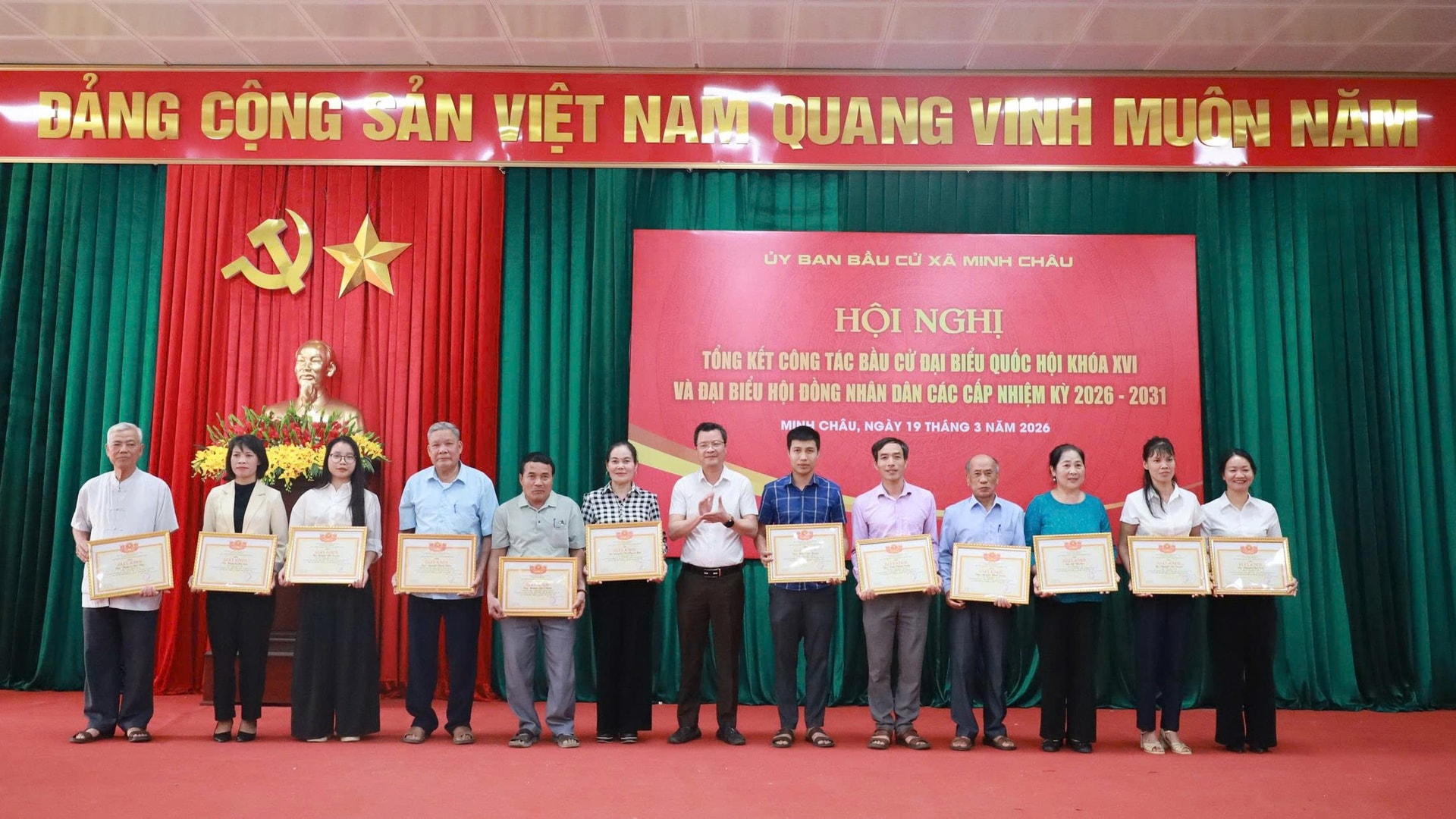 Nhân dịp này, UBND xã Minh Châu khen thưởng 10 tập thể và 43 cá nhân có thành tích xuất sắc trong công tác bẩu cử Đại biểu Quốc hội khóa XVI và Đại biểu HĐND các cấp nhiệm kỳ 2026 - 2031.