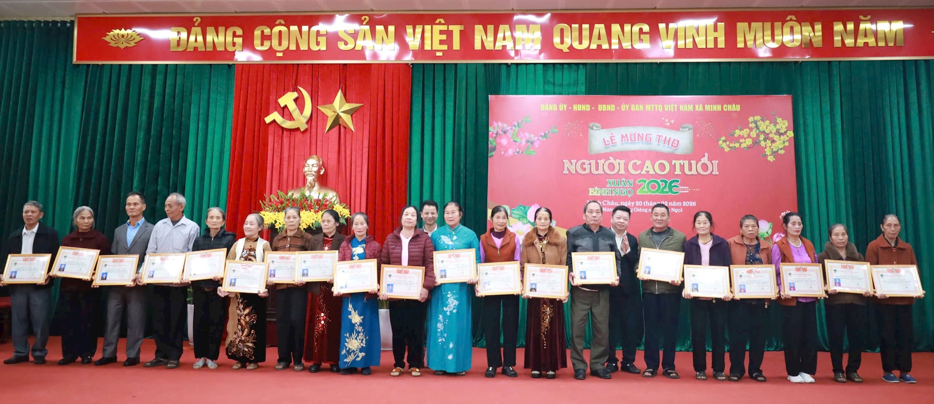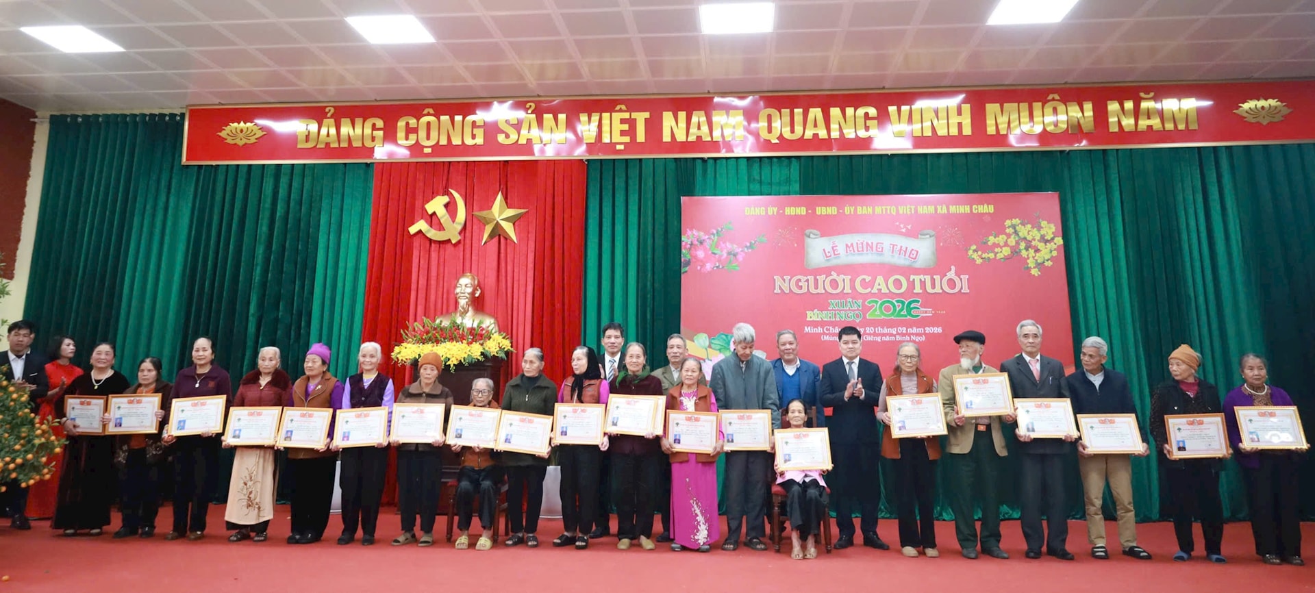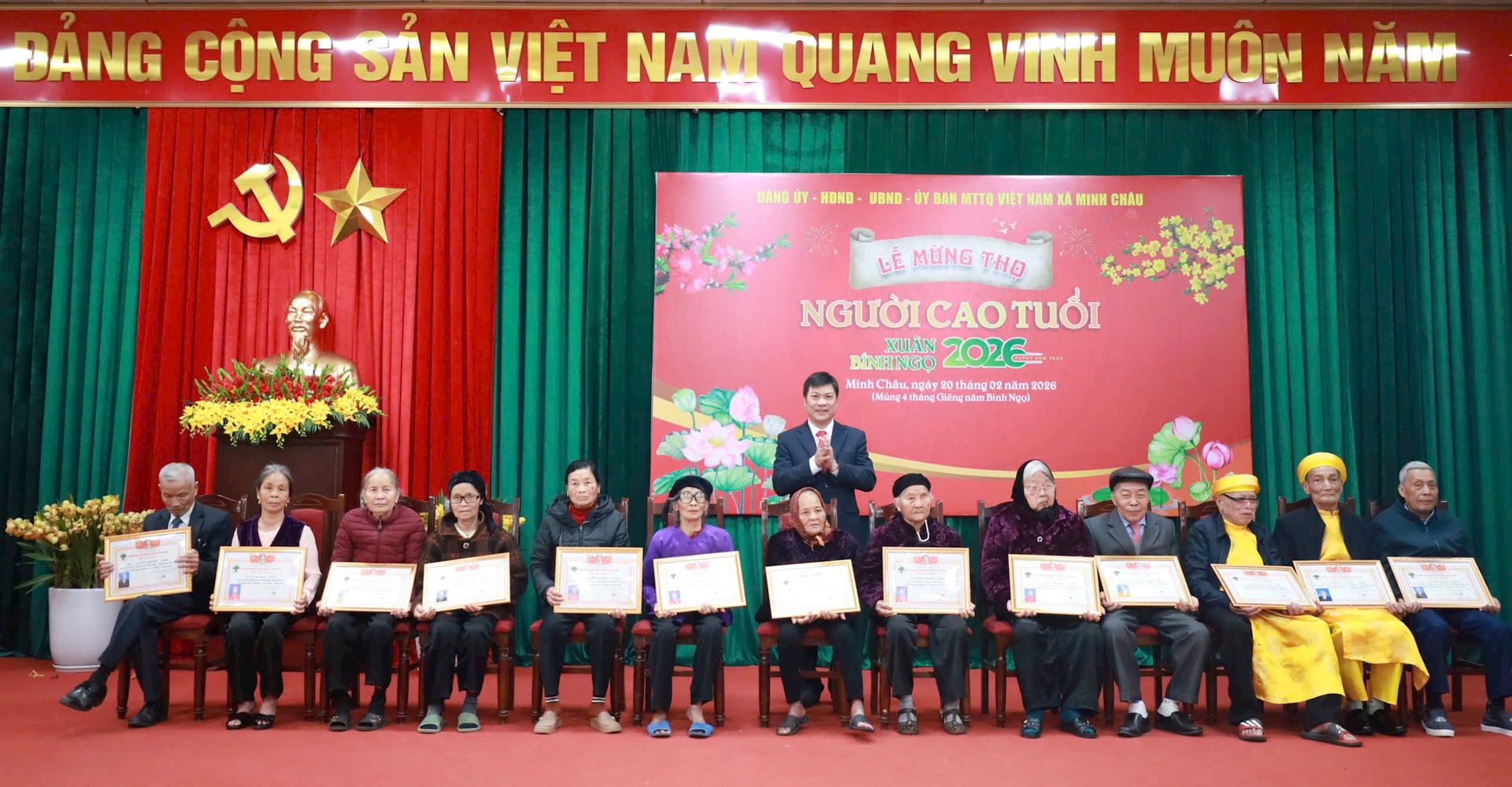 Dịp xuân Bính Ngọ 2026, xã Minh Châu có 116 cụ được mừng thọ tuổi tròn. Trong không khí trang trọng, ấm áp, lãnh đạo xã đã trao giấy chứng nhận, gửi lời chúc mừng tốt đẹp tới các cụ tròn 100, 95, 90, 85, 80, 75 và 70 tuổi, thể hiện sự trân trọng, biết ơn của Đảng bộ, chính quyền và nhân dân đối với những đóng góp của các thế hệ đi trước.