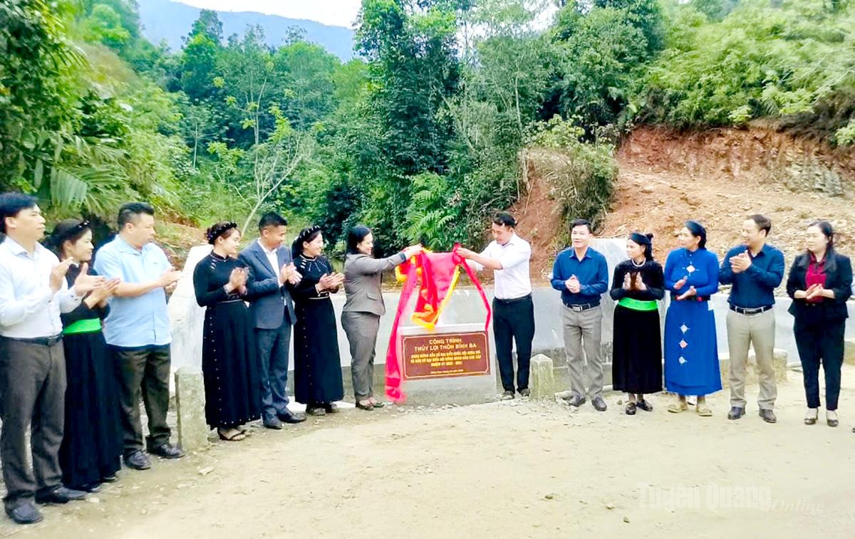 Các đại biểu khánh thành công trình đập tràn chào mừng bầu cử tại thôn Bình Ba, xã Minh Sơn.