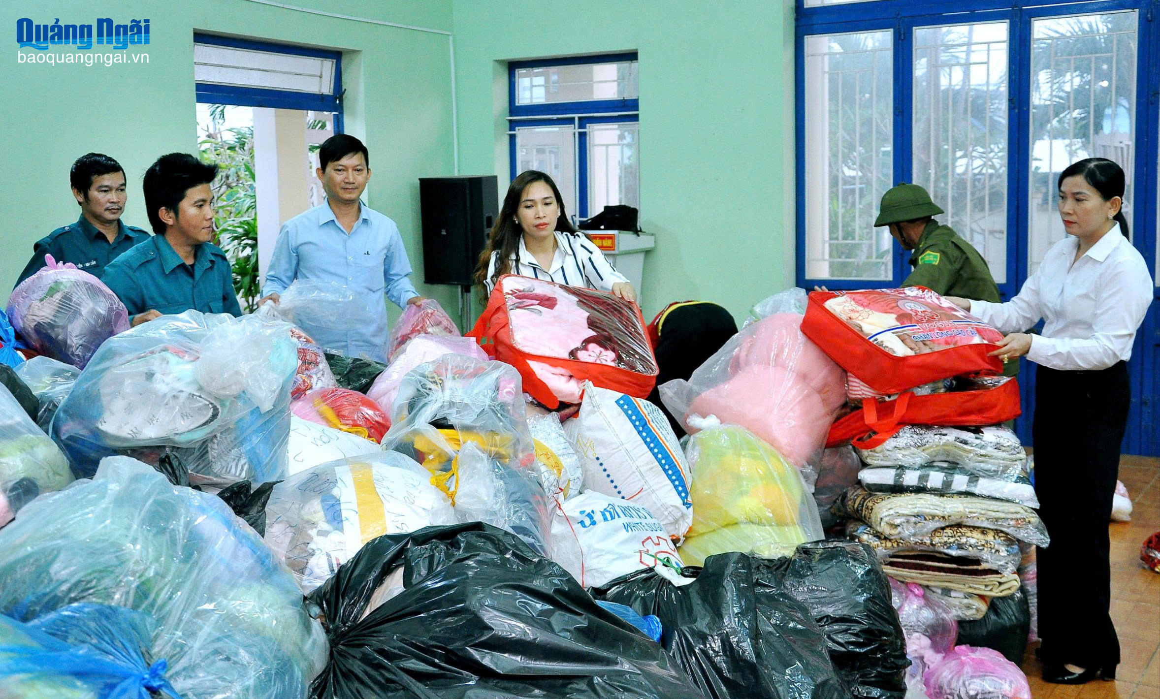 Mền, chiếu, gối, quần áo... được quyên góp để gửi đến người dân vùng lũ. ẢNH: ĐPCC