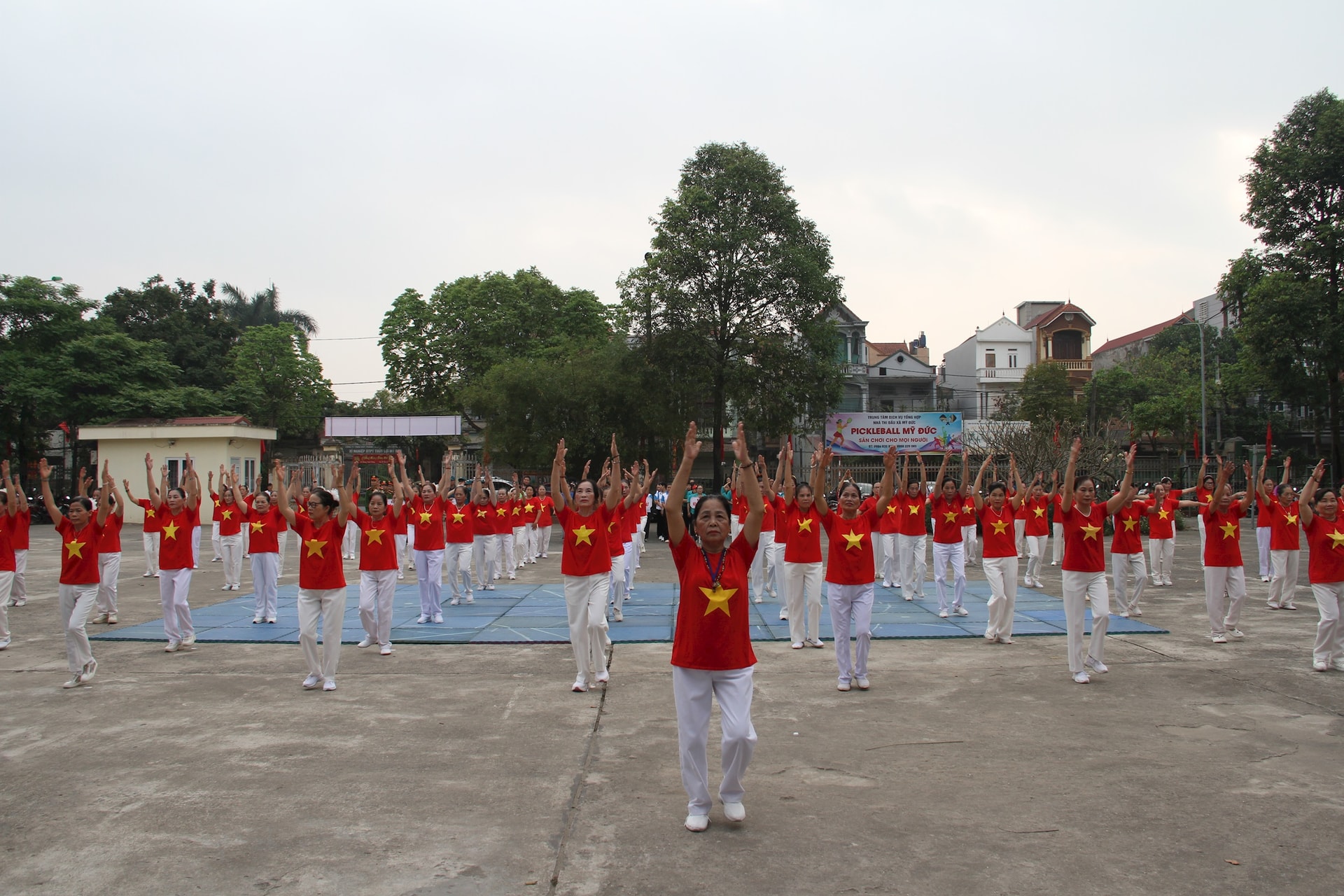 Màn biểu diễn thể dục dưỡng sinh tại lễ khai mạc của các hội viên Hội Người cao tuổi xã MỸ Đức. Ảnh: VB