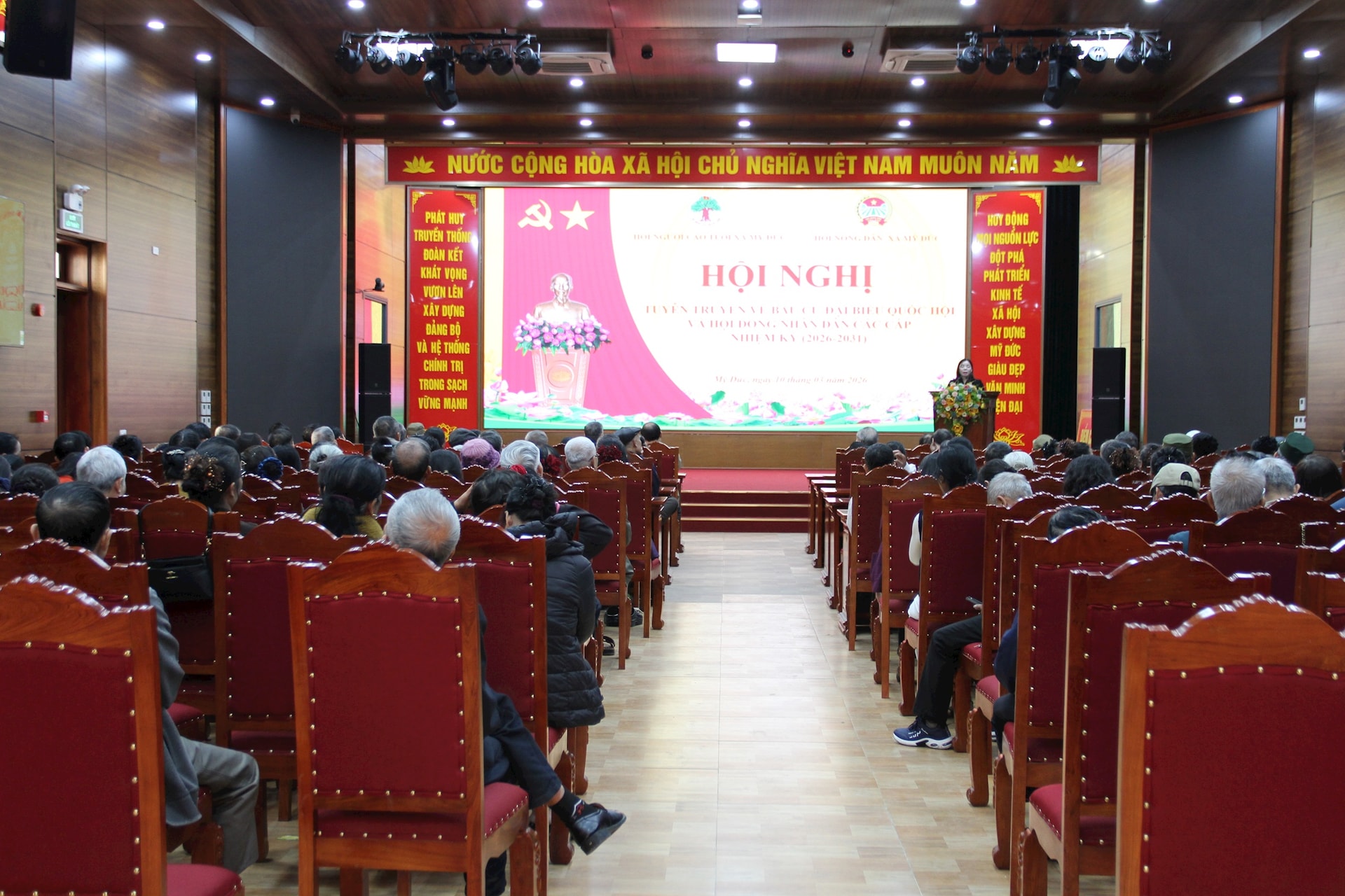 Quang cảnh hội nghị tuyên truyền bầu cử đại biểu Quốc hội khóa XVI và đại biểu HĐND các cấp nhiệm kỳ 2026-2031 do Hội Nông dân và Hội Người cao tuổi xã Mỹ Đức tổ chức sáng 10-3. Ảnh: VB