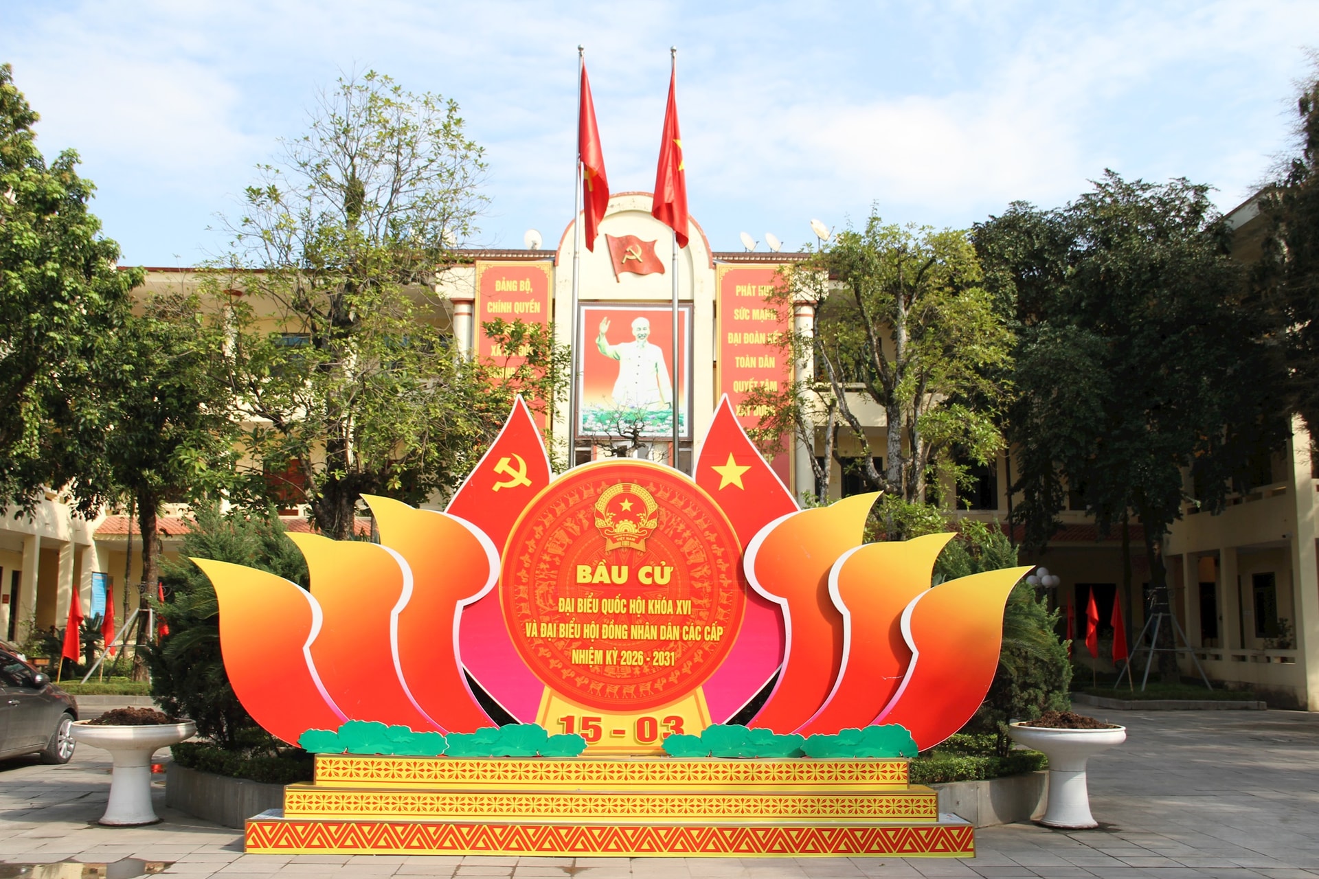 Trụ sở Đảng ủy xã Mỹ Đức được trang trí rực rỡ. Ảnh: VB