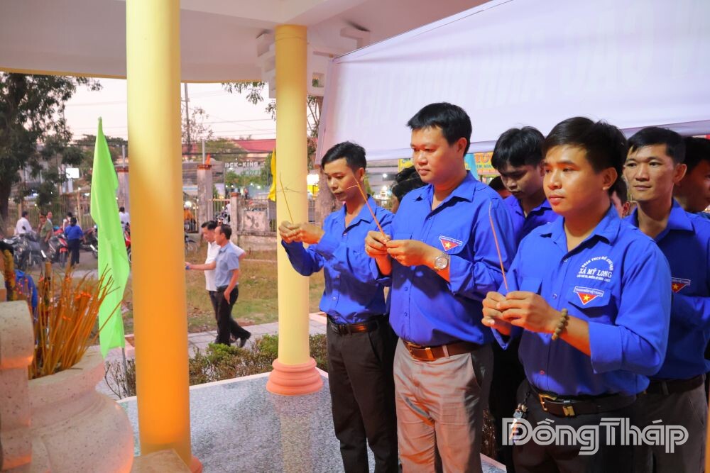 Đoàn viên, thanh niên xã Mỹ Hiệp thực hiện nghi thức dâng hương, thắp nến tri ân các Anh hùng liệt sĩ tại Nhà bia tưởng niệm.