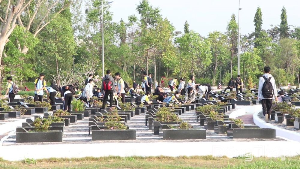 Học sinh Trường Trung học phổ thông Cao Lãnh 1 vệ sinh khuôn viên Nghĩa trang Liệt sĩ Cao Lãnh.