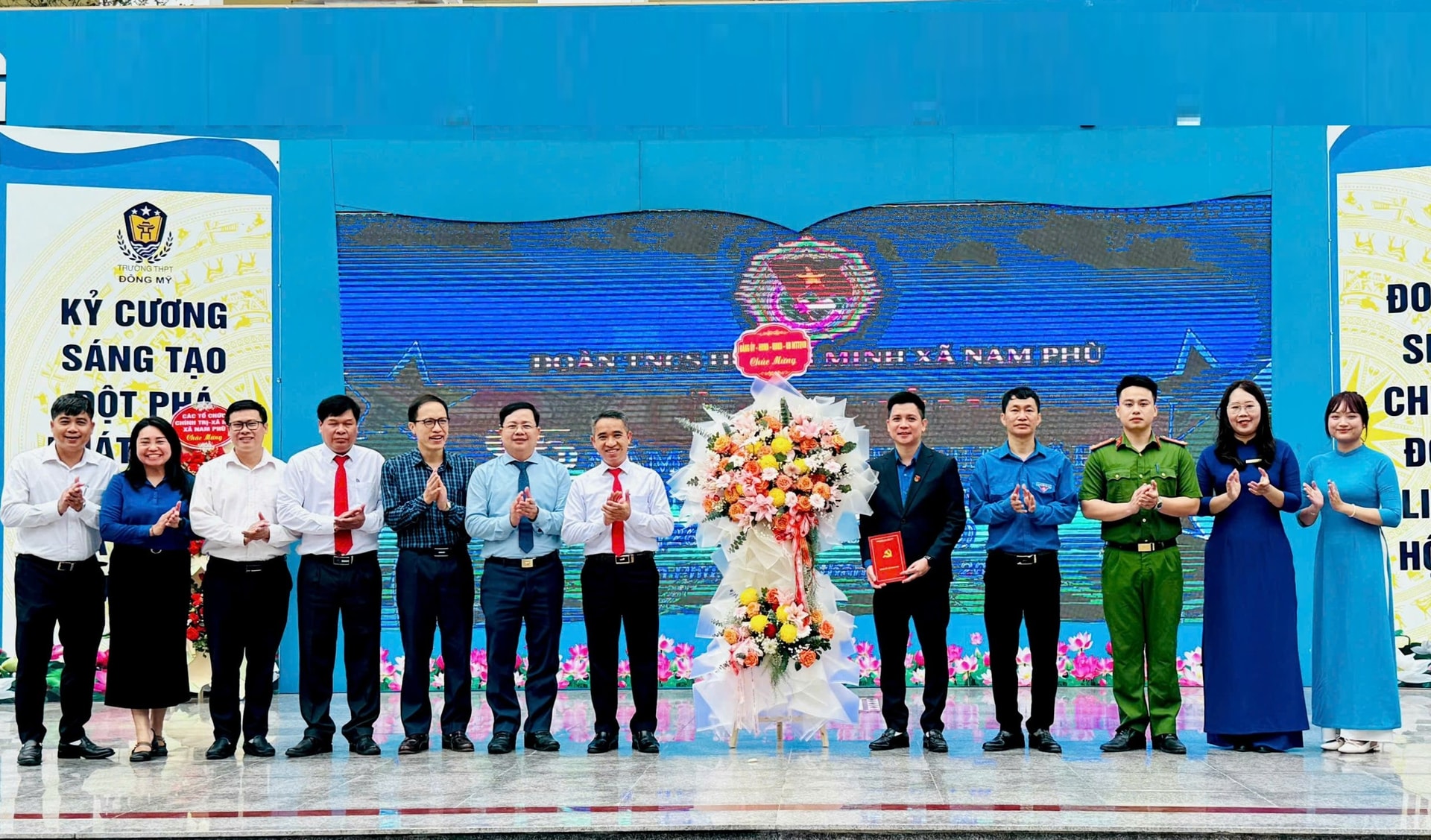 Lãnh đạo Đảng ủy, Ủy ban nhân dân, Hội đồng nhân dân, Ủy ban MTTQ xã Nam Phù tặng hoa chúc mừng Đoàn Thanh niên. Ảnh: Phương Xuyến