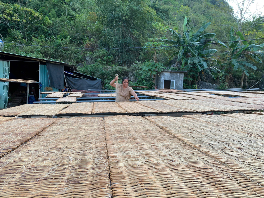 Ngoài ra, để nâng cao giá trị từ cây dong riềng, thay vì bán củ tươi, xã có 2 hợp tác, 204 hộ dân trực tiếp thu mua, làm miến với giá bán trung bình từ 50 - 60 nghìn đồng/kg, cao điểm lên đến 70 nghìn đồng/kg.