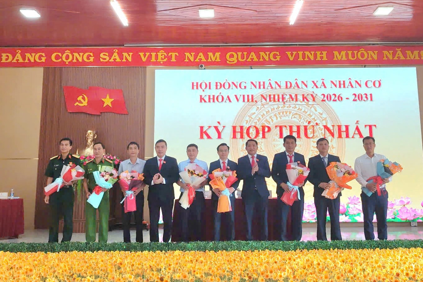HĐND xã Nhân Cơ trao hoa chúc mừng Chủ tịch UBND xã và các thành viên ủy ban
