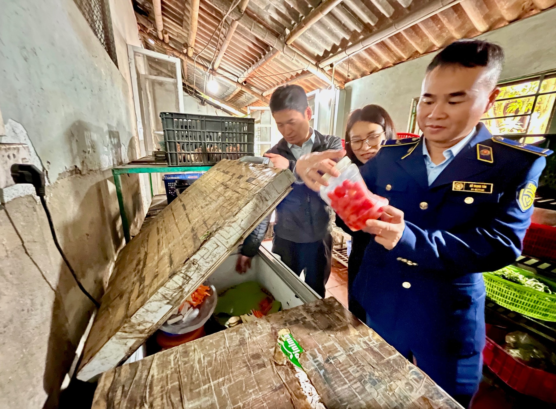 Đoàn liên ngành thành phố Hà Nội kiểm tra một cơ sở kinh doanh thực phẩm tại xã Nội Bài. Ảnh: Tùng Nguyễn.