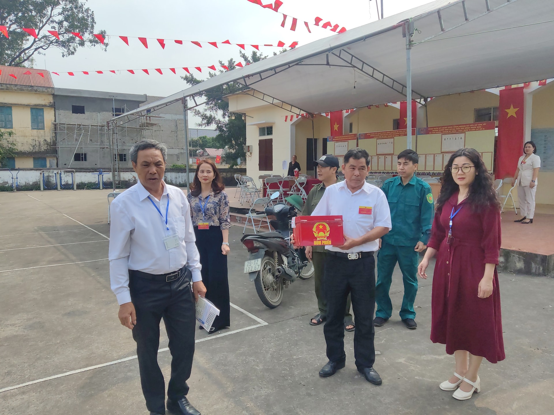 Đoàn công tác chuẩn bị hòm phiếu đến các nhà cử tri không thể đi bỏ phiếu trực tiếp. Ảnh: Khắc Kiên