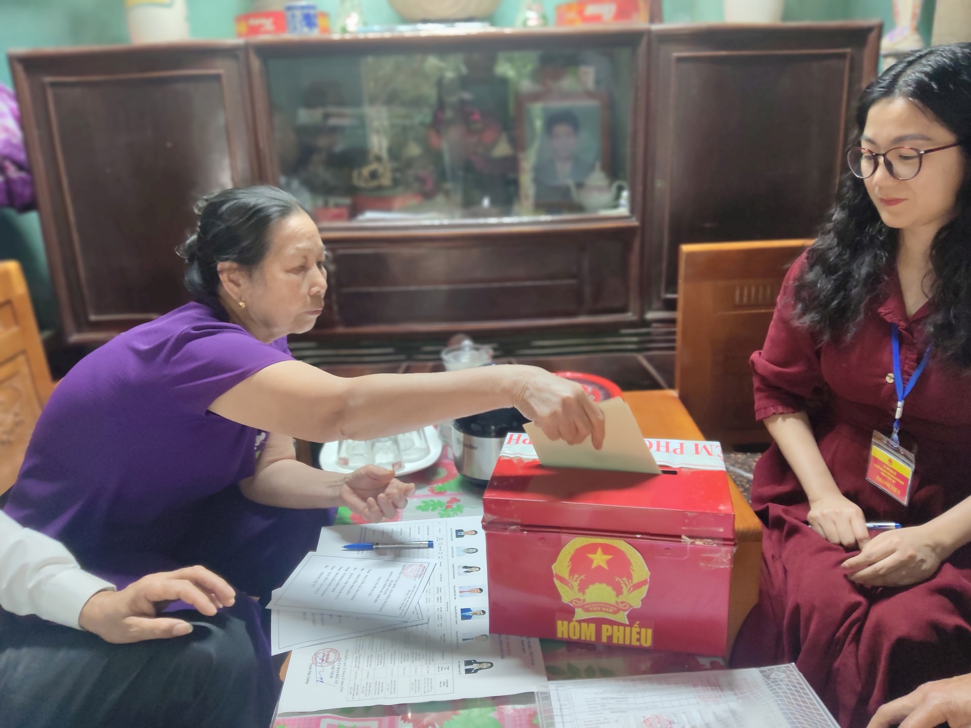 Cử tri Lê Thị Lê thực hiện quyền công dân của mình ngay tại nhà. Ảnh: Khắc Kiên
