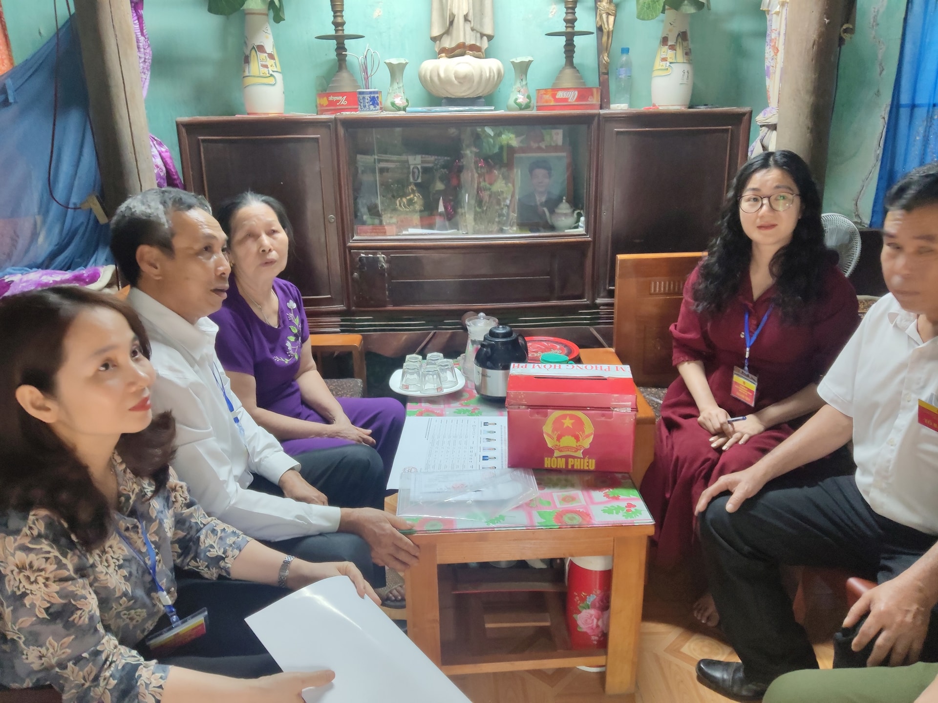 Đoàn công tác do Phó Chủ tịch Thường trực UBND, Ủy viên Ủy ban Bầu cử xã Trần Thị Thu Hằng dẫn đầu mang hòm phiếu phụ đến gia đình bà Lê Thị Lê (sinh năm 1947, thôn Thanh Nê). Do hoàn cảnh sức khỏe và gia đình khó khăn, bà không thể đến điểm bầu cử nên được tạo điều kiện bỏ phiếu tại nhà. Bà Lê Thị Lê bày tỏ xúc động và cảm ơn tổ công tác đã tạo điều kiện để vợ chồng bà vẫn được thực hiện quyền công dân.
