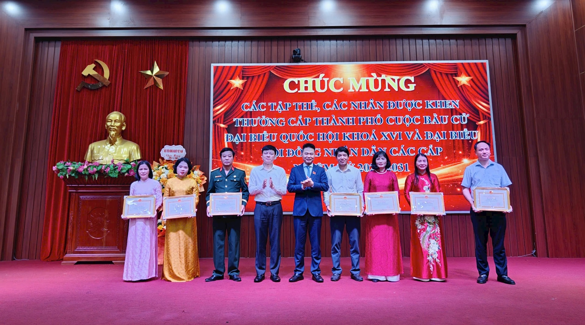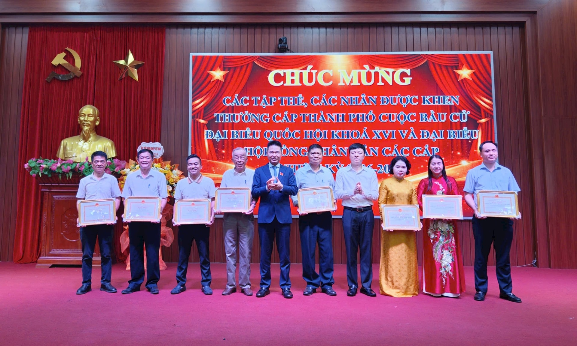Khen thưởng các tập thể, cá nhân có thành tích xuất sắc trong công tác bầu cử. Ảnh: Minh Phương