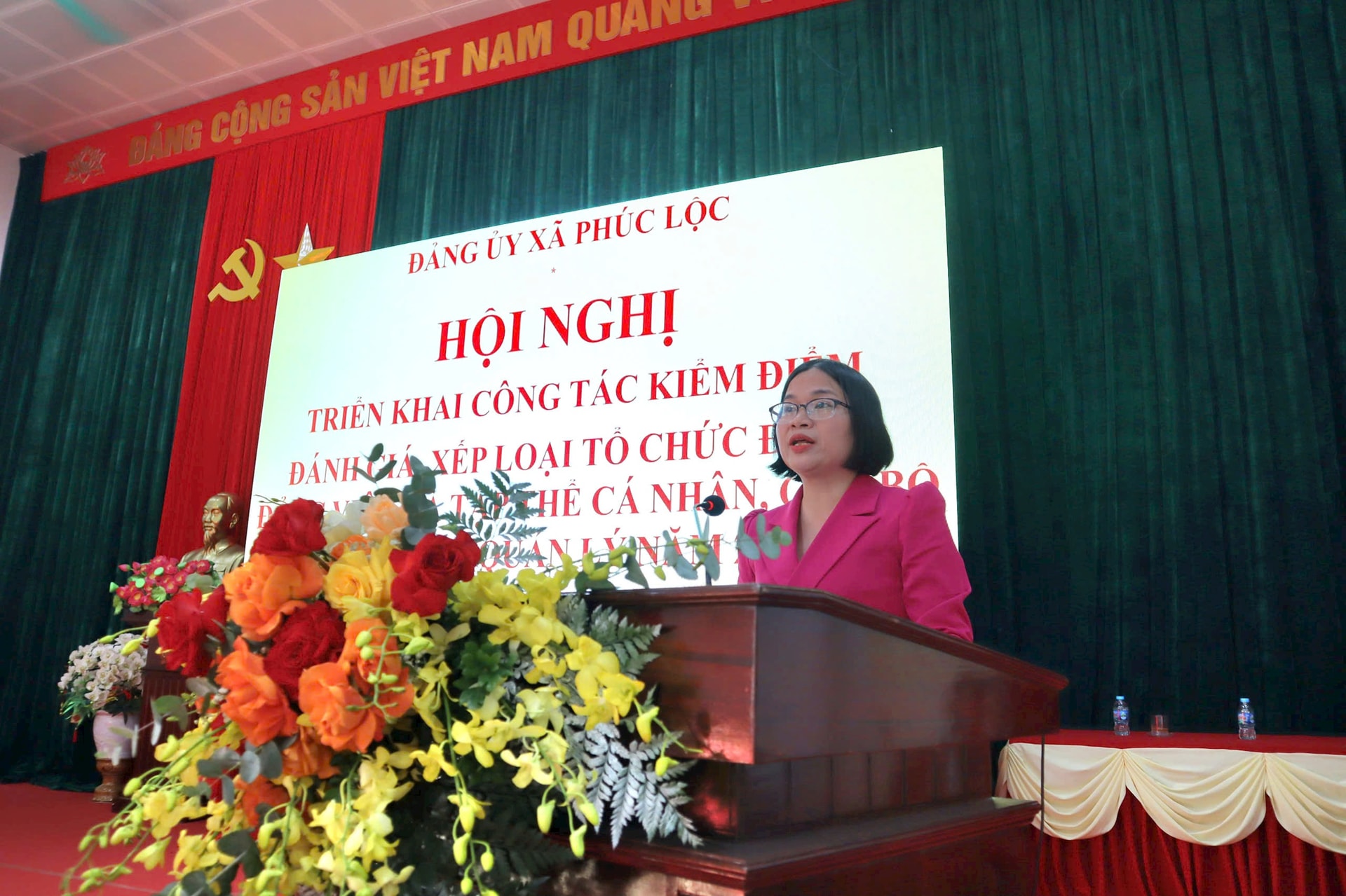 Trưởng ban Xây dựng Đảng xã Phúc Lộc Hoàng Thị Trang triển khai công tác kiểm điểm, đánh giá, xếp loại tổ chức Đảng, đảng viên và tập thể, cá nhân cán bộ lãnh đạo, quản lý năm 2025. Ảnh: Minh Phú