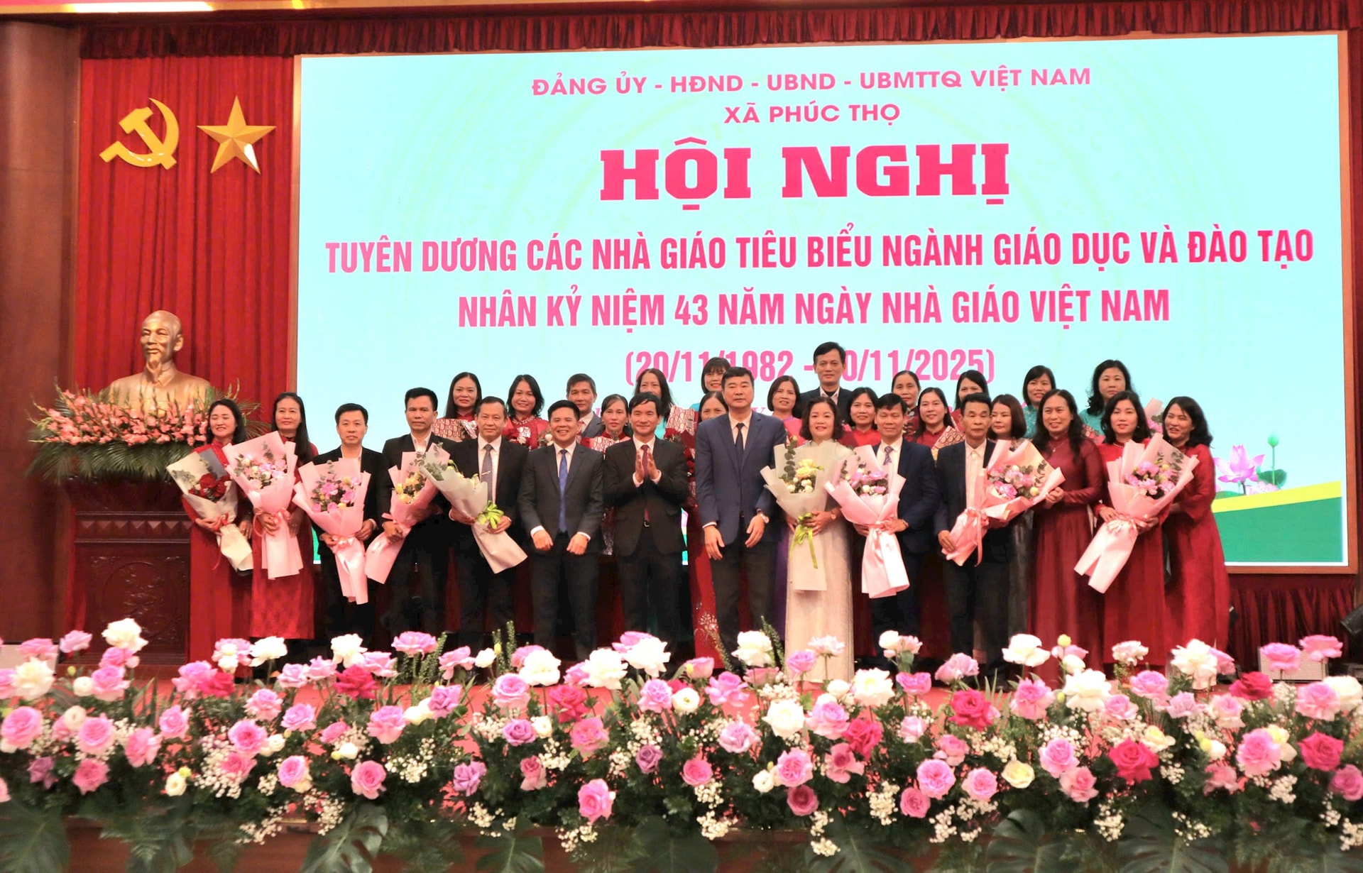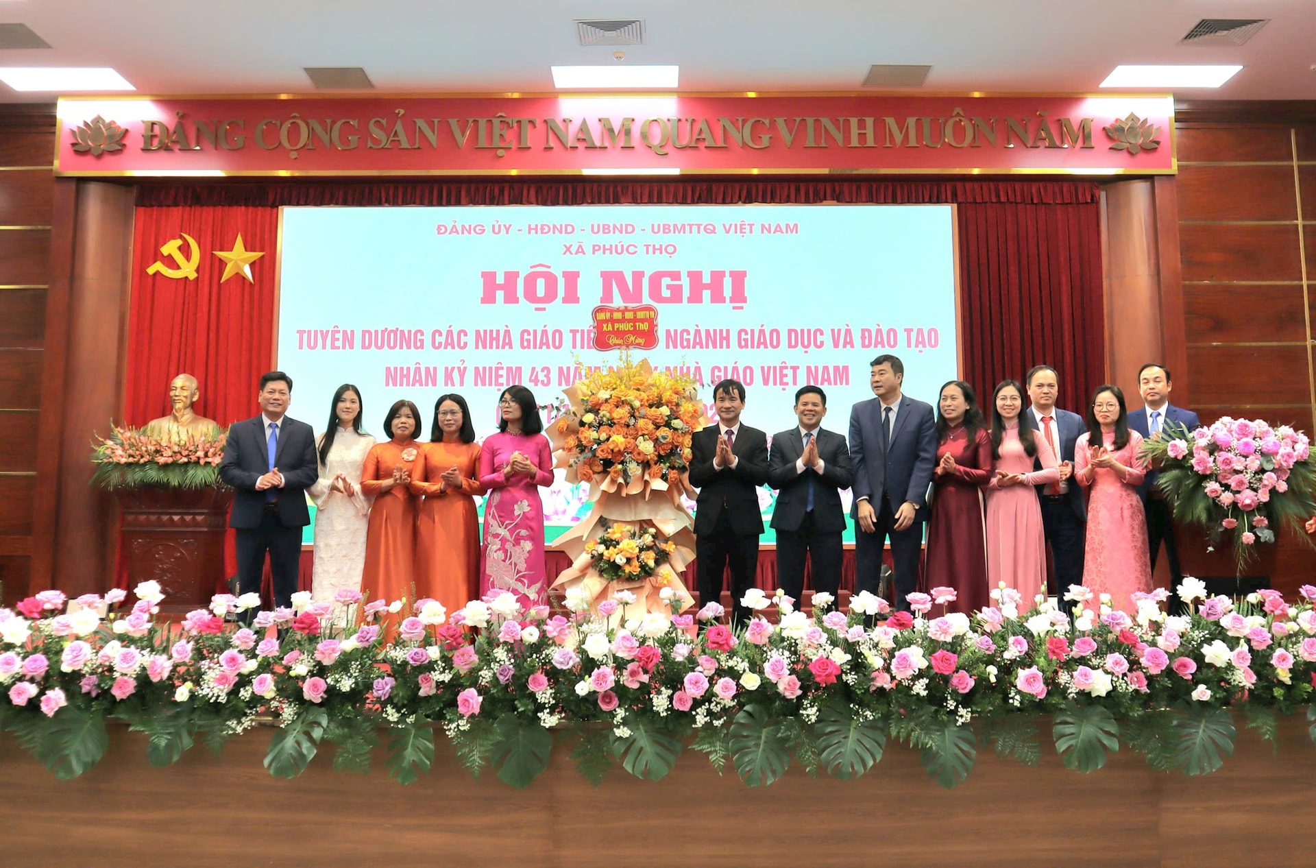 Lãnh đạo xã Phúc Thọ tặng hoa chúc mừng đại diện các thầy cô giáo các nhà trường trên địa bàn. Ảnh: Minh Phú