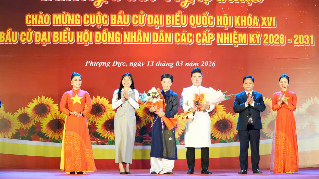Lãnh đạo xã Phượng Dực tặng hoa đại diện Nhà hát chèo Hà Nội và các đội văn nghệ. Ảnh: TV