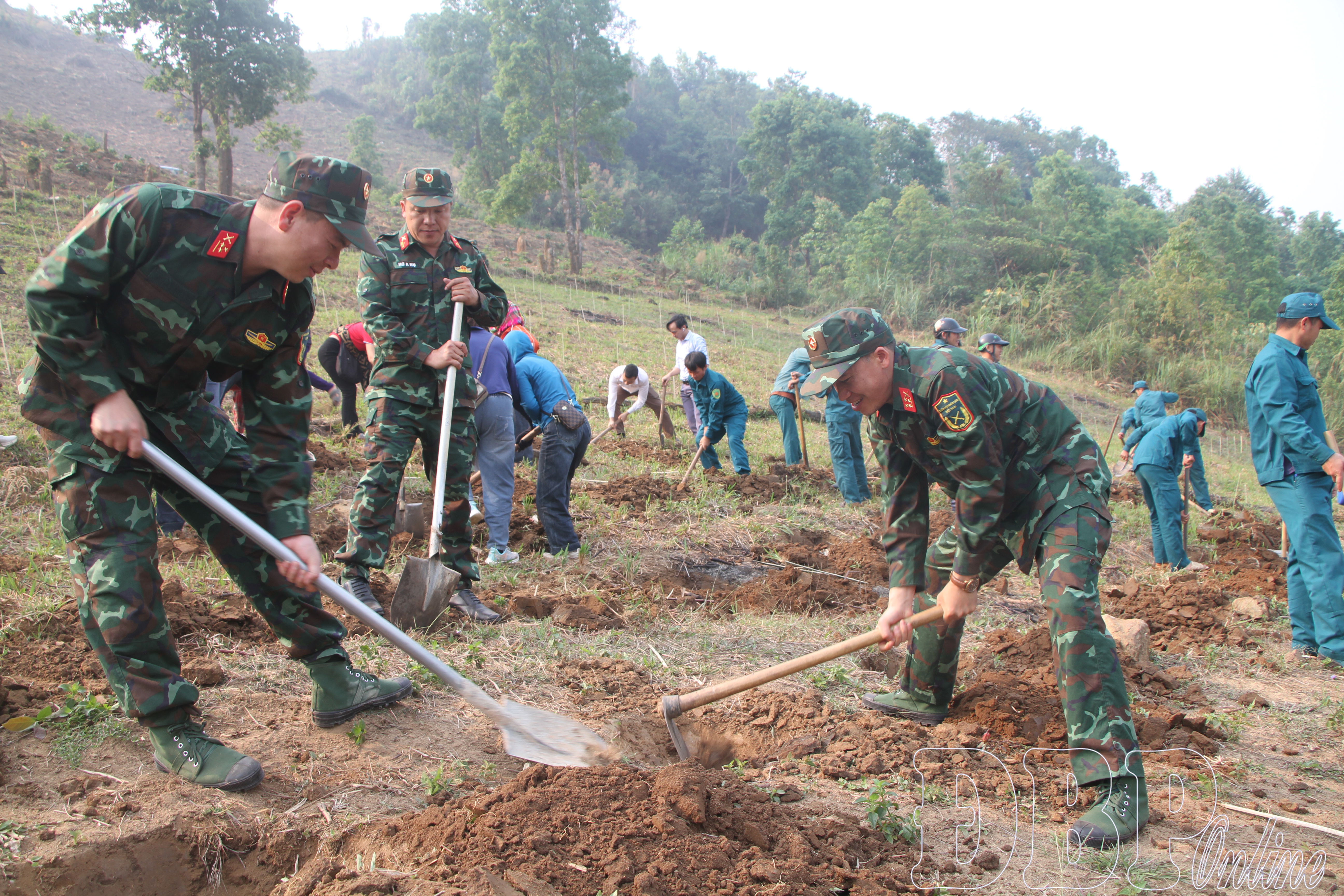 Các lực lượng tham gia đào hố trồng cây.