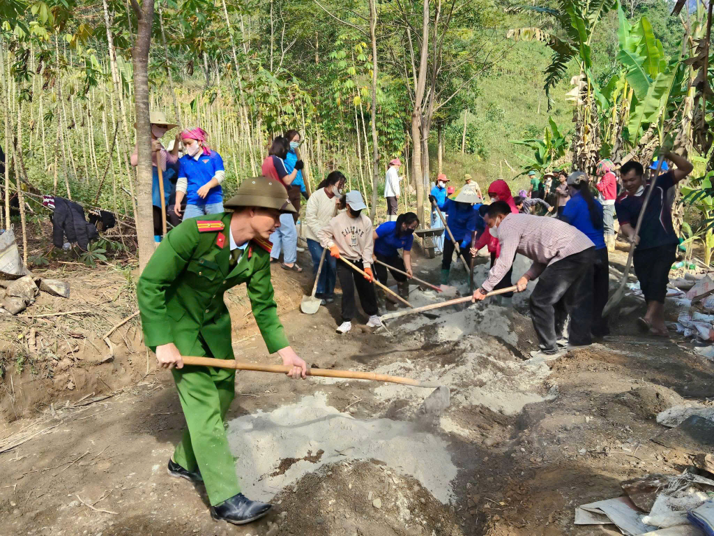 Cán bộ, nhân dân xã Quảng Lâm đổ bê tông tuyến đường giao thông nông thôn vào xóm Nà Đon.