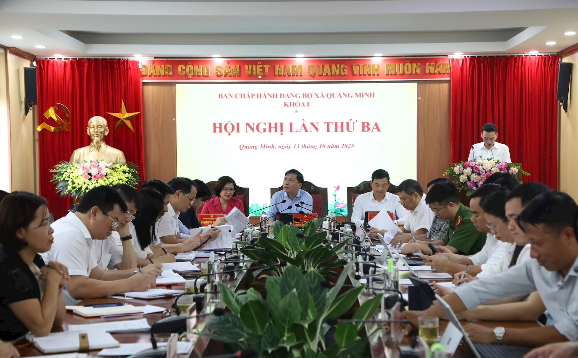 Ngày 13-10, Đảng ủy xã Quang Minh tổ chức Hội nghị Ban Chấp hành Đảng bộ xã lần thứ 3, nhằm đánh giá kết quả công tác xây dựng Đảng, xây dựng hệ thống chính trị và tình hình phát triển kinh tế - xã hội 9 tháng đầu năm 2025; đồng thời xác định phương hướng, nhiệm vụ trọng tâm 3 tháng cuối năm.