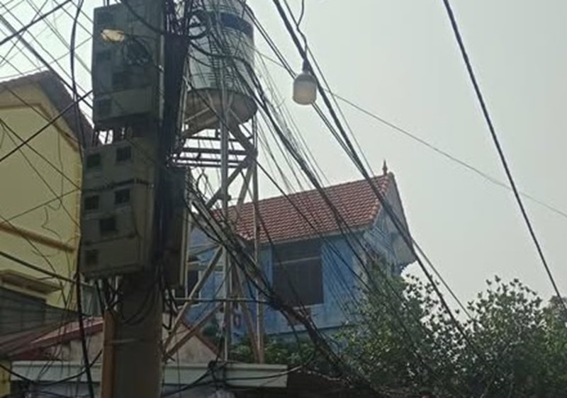 Dây điện, cáp viễn thông chằng chịt trên các tuyến đường ở xã Quang Minh. Ảnh: ST
