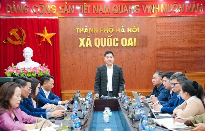 Bí thư Đảng ủy xã Quốc Oai Nguyễn Trường Sơn chủ trì hội nghị. Ảnh: Nguyễn Khải