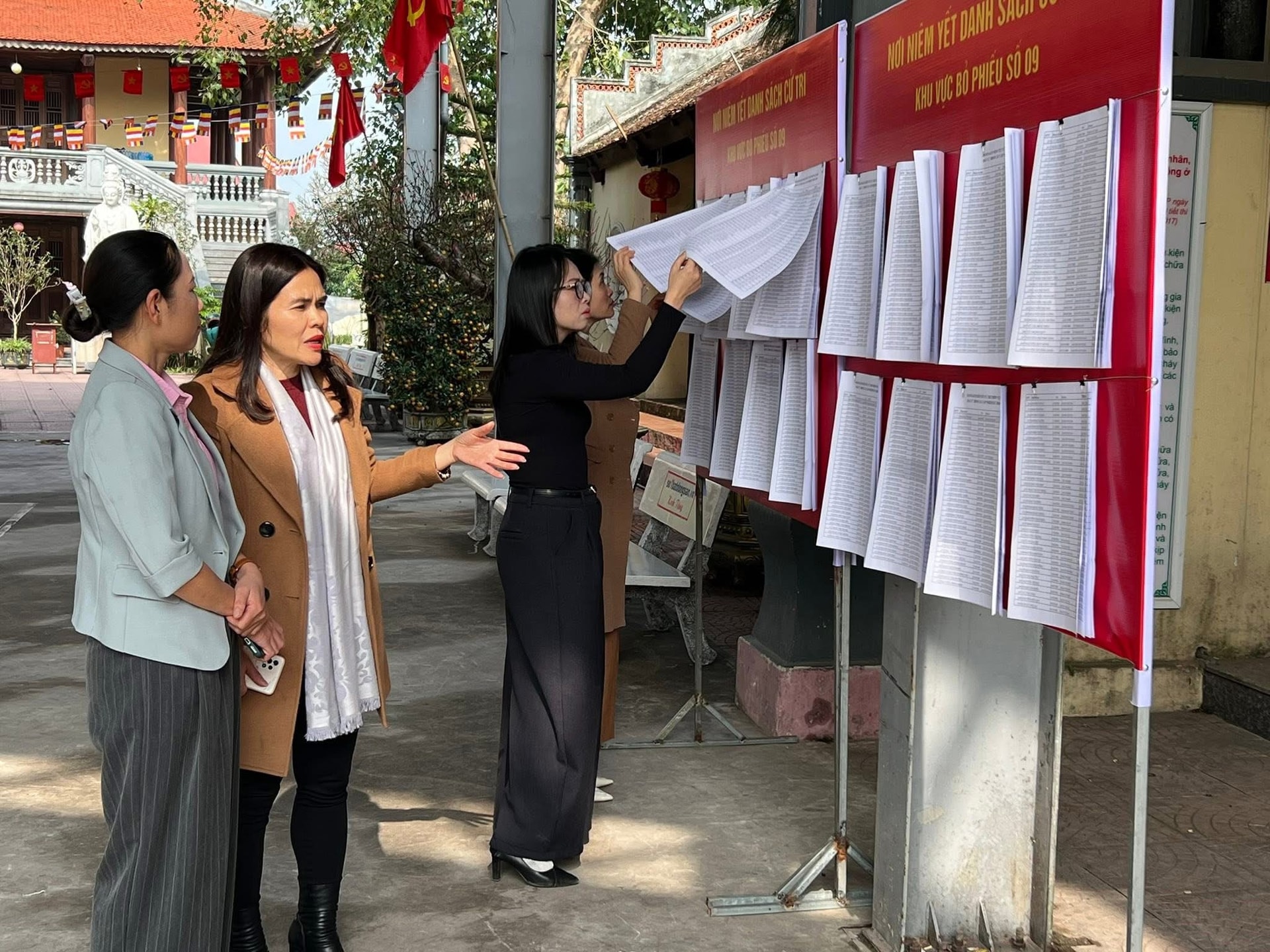 Ủy ban Bầu cử xã Sóc Sơn kiểm tra việc niêm yết danh sách cử tri. Ảnh: Đỗ Hà