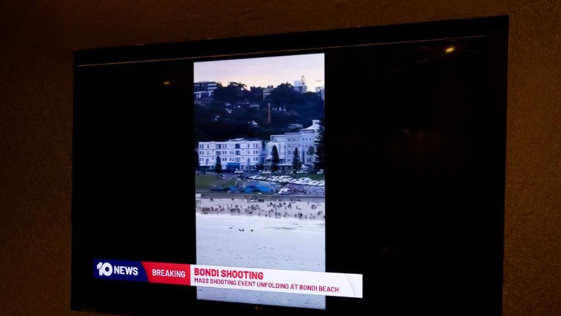 Một kênh truyền hình đưa tin về vụ xả súng trên bãi biển Bondi ở thành phố Sydney, bang New South Wales, Australia, ngày 14/12/2025. (Ảnh: Tân Hoa Xã)