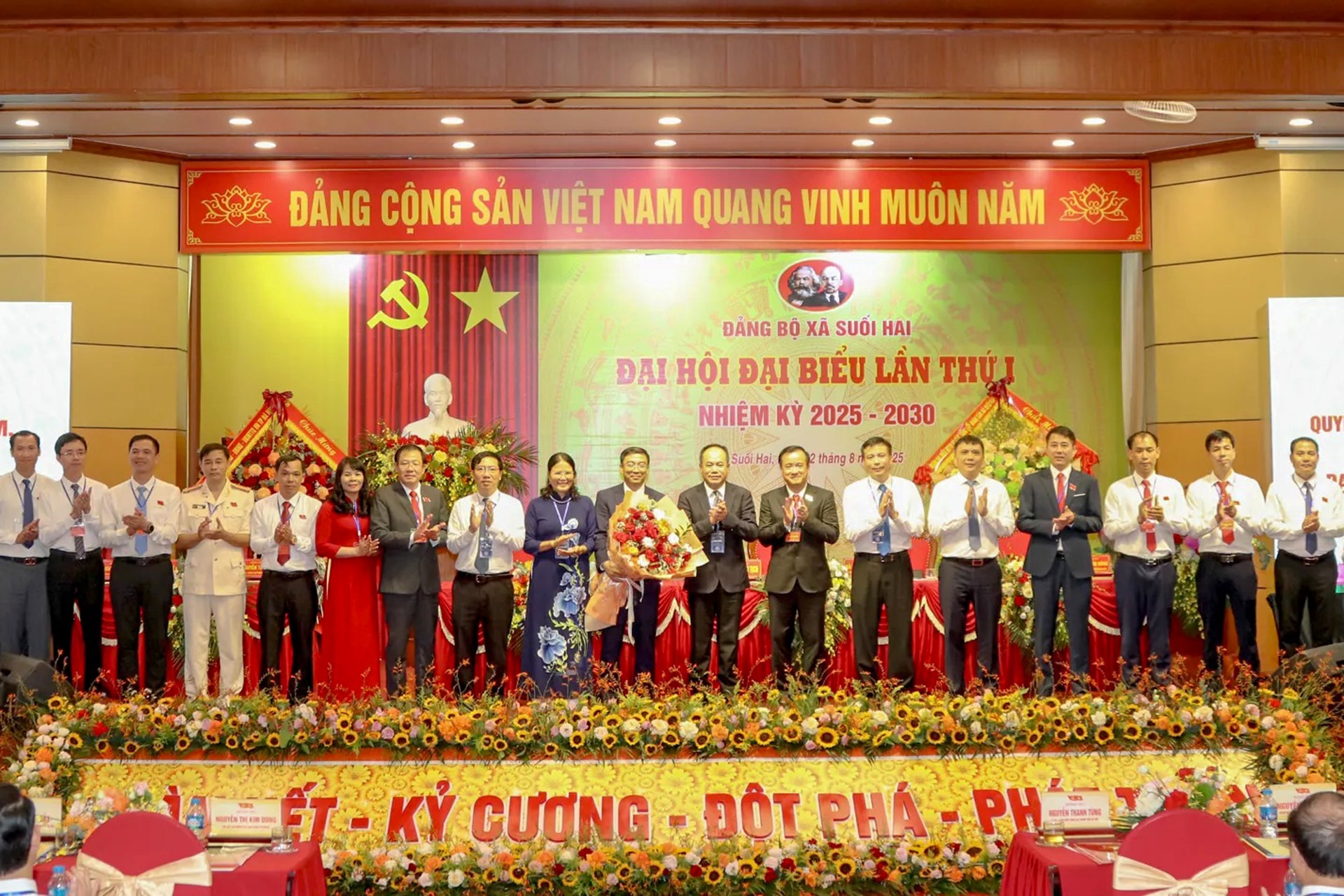 Trung tướng Nguyễn Thanh Tùng, Ủy viên Ban Thường vụ Thành ủy, Giám đốc Công an thành phố Hà Nội chúc mừng Ban Chấp hành Đảng bộ xã Suối Hai nhiệm kỳ 2025 - 2030. Ảnh: Sơn Tùng