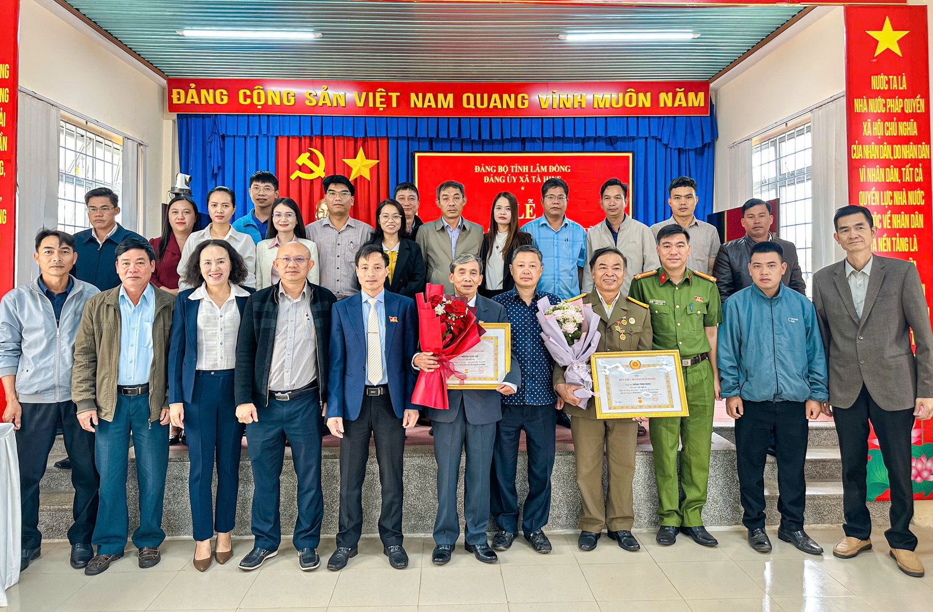 Các đồng chí lãnh đạo xã chụp hình lưu niệm cùng các đảng viên được nhận huy hiệu đảng đợt này.